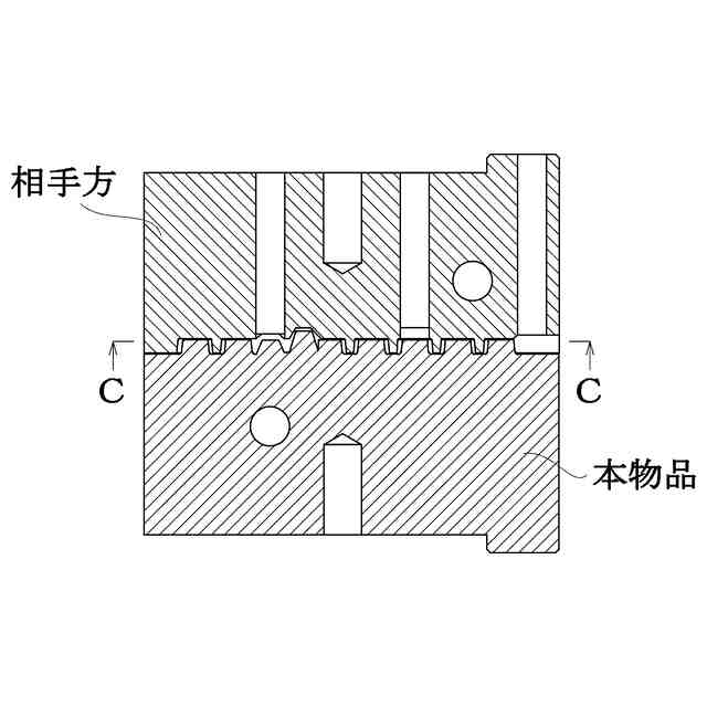 本物品はダイカスト用チルベントであり、使用状態を示す参考A-A線断面図に示すように、ダイカスト金型の固定型又は可動型である相手方の合わせ面に取り付けて使用し、使用状態を示す参考C-C線断面図に示すように、本物品の凸部と相手方の凸部との間に流路を形成する。