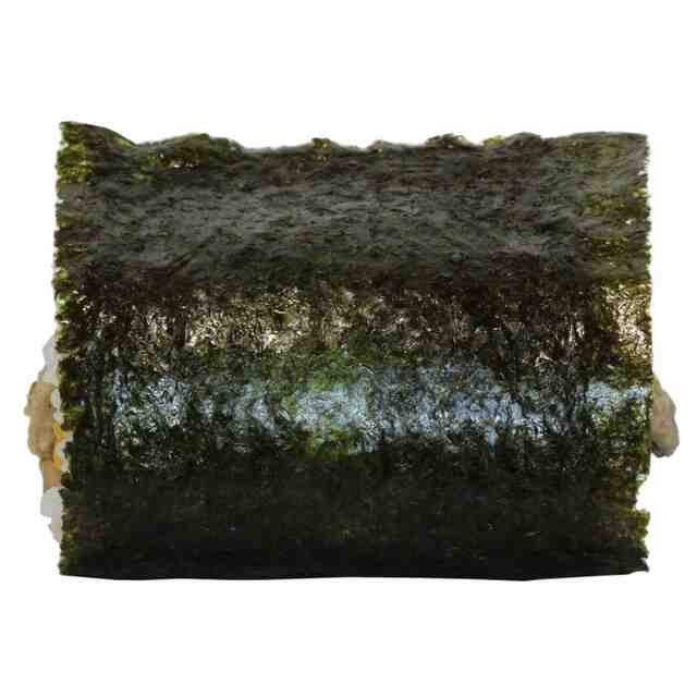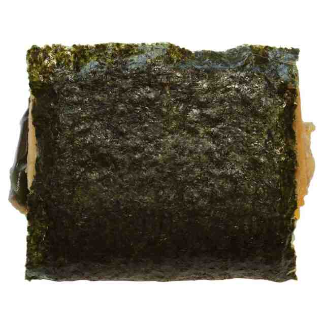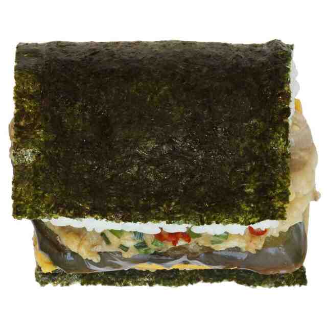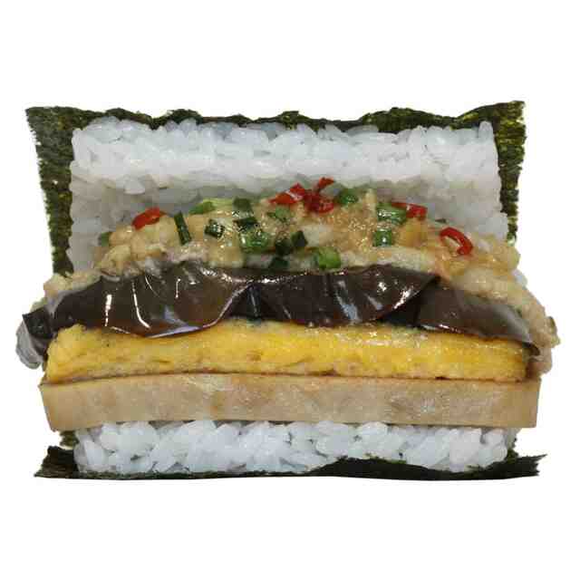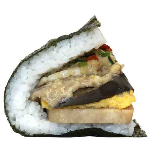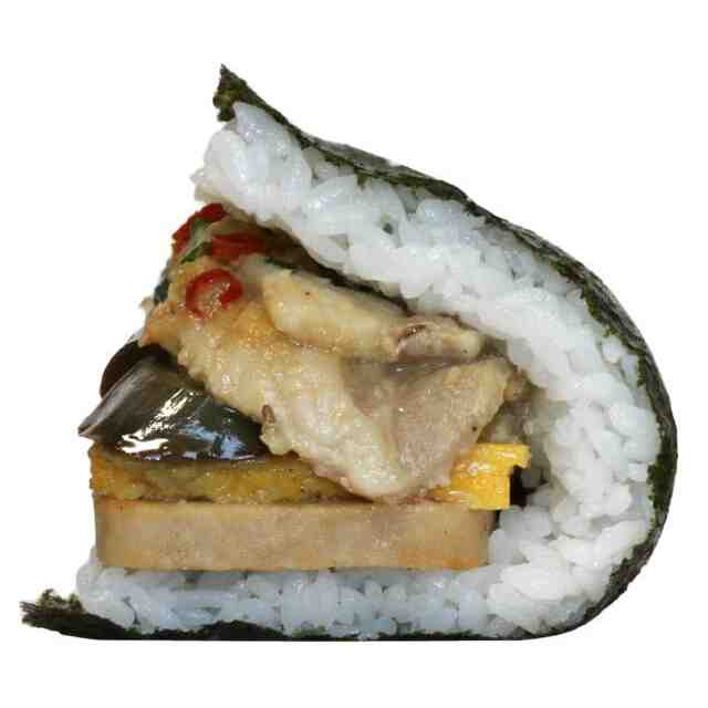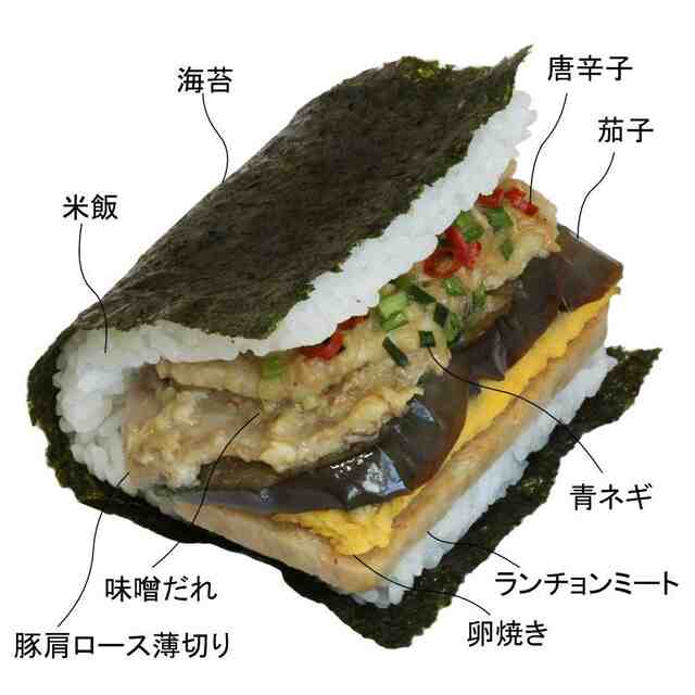 本物品は、2つ折りした扁平状の海苔付き米飯の間に、複数の具材を挟み込んだおにぎりである。各部の名称を示す参考図のように、上下の米飯の間の各具材はそれぞれ、青ネギ、味噌だれ、豚肩ロース薄切り、唐辛子、茄子、卵焼き、ランチョンミート、である。本物品は、斜視図、正面図、右側面図及び左側面図に示すように各具材の全てが、斜め上側、正面側及び左右側面から視認できる。