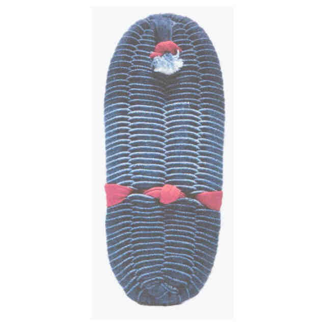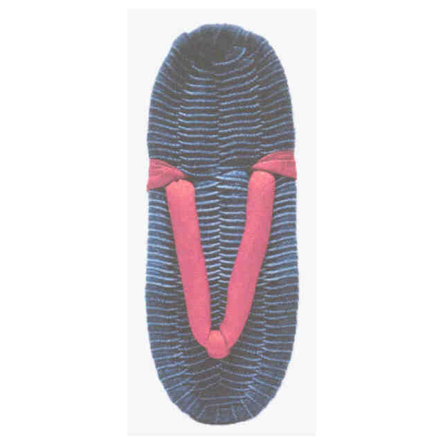 本物品は布草履に関するものであり、草履台に各種の好みの鼻緒をすげて主に室内履きの草履として使用するものである。本物品は、デニムパンツ等のベルトループを使用し編み上げた布草履である。デニムの濃淡を活かした配色と、ベルトループの規則正しく繰り返される波のような編み目に加え、デニムの藍に染まっていない白地が明るく見え、より編み目の美しさを強調したデザインである。
