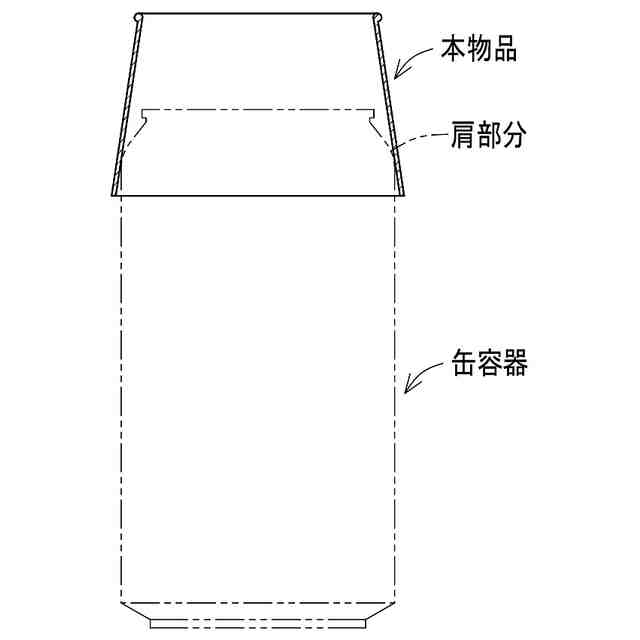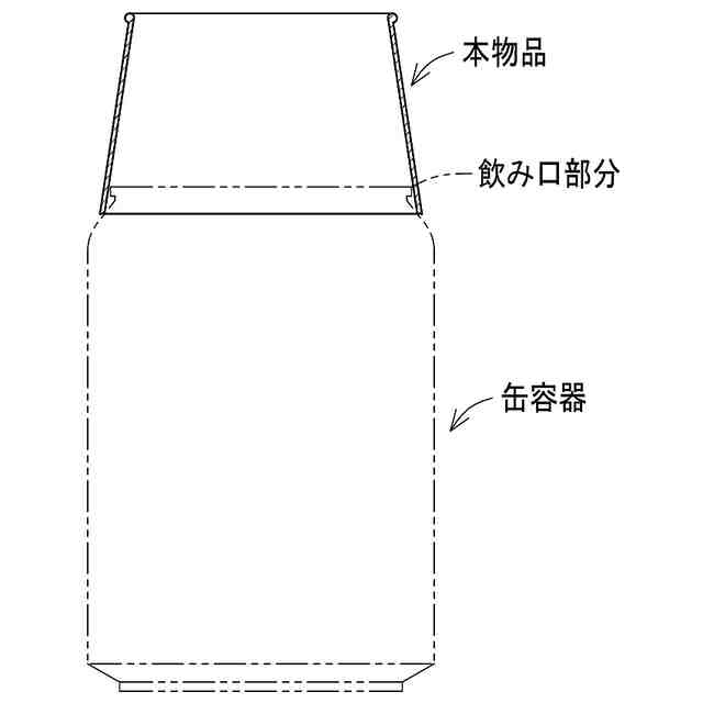 本物品は、飲料を封入した缶容器の上部に取付けて使用する飲み口用キャップである。本物品は全体がシート材からなり、下方へ拡径した部分円錐状の筒体と、筒体上端の環状膨らみ部とが一体形成される。本物品を使用する際は、缶飲料の上部に筒体の下部をはめ込んで取付ける。取り付けた状態で筒体の下部が弾性変形し、飲料を封入した缶容器の上部の傾斜面に接した密着状態となる。筒体は部分円錐状をなすことで、使用状態例1、使用状態例2の各一部断面参考図に示すように、缶容器の飲み口部分、又は缶容器の肩部分に密着した状態で取付けられる。また、筒体上端の環状膨らみ部は、内側辺が傾斜し外角部がアール状に成形された断面からなることでやわらかな口当りとなるようにしている(B-B拡大図参照)。すなわち、本物品を缶容器に取り付けることで、缶容器やプルタブに口唇が触れることなく飲むことができ、また、缶容器を傾けて環状膨らみ部から飲料を流すことで、グラスから飲むときのような自然な飲み口で飲むことができる。また、使用状態例3(スタックさせた状態)の断面図に示すように、本物品を複数個、重ね合わせて収容時の状態とすることもできる。