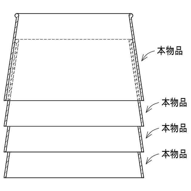 背面図、右側面図、左側面図はいずれも正面図と同一に表れるため省略する。本物品は表面全体が無模様かつ一色で構成される。各図にて物品の表面に表れる細線は形状変化の境界として表れる稜線であって物品表面に付された模様ではない。