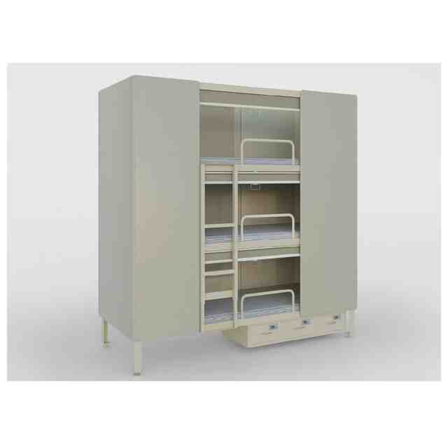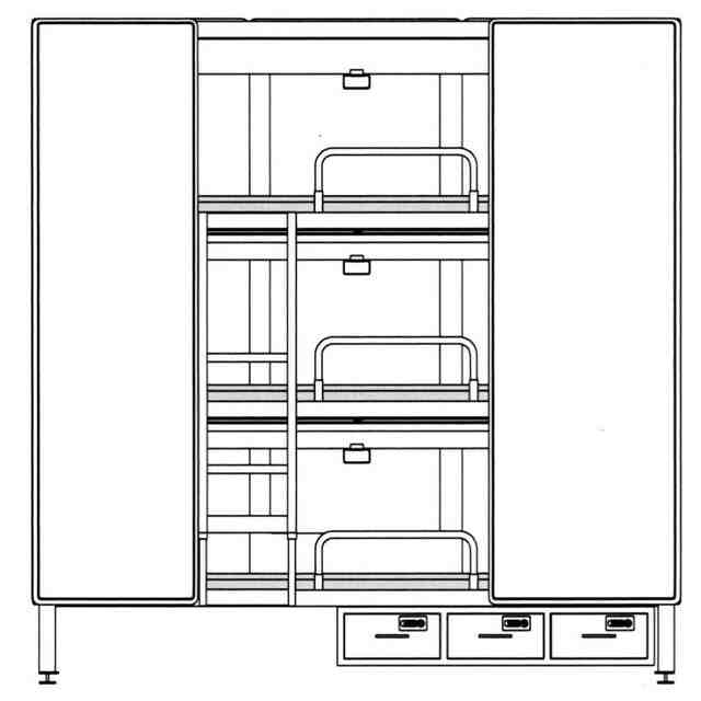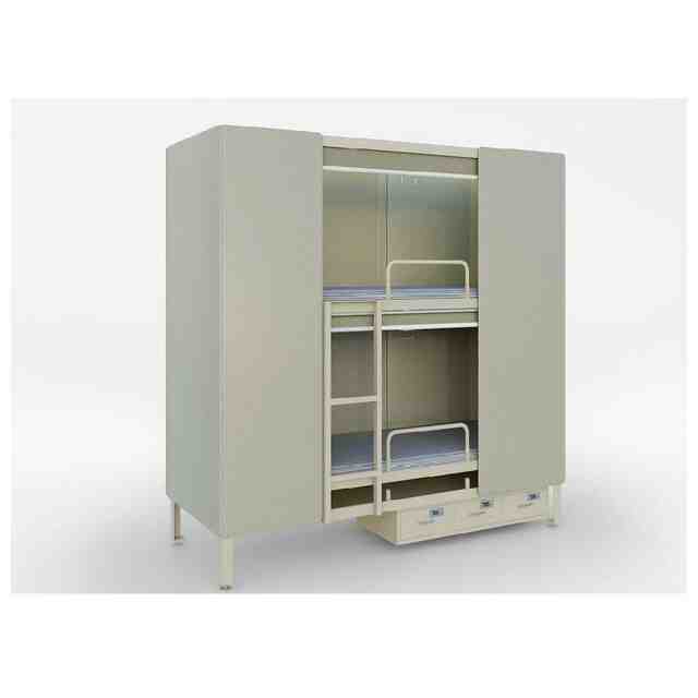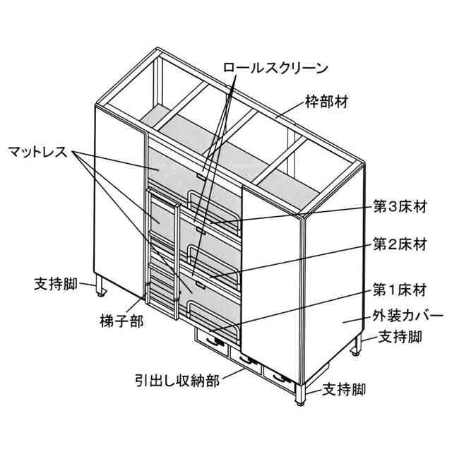 本物品は、船舶の乗員室に設置されるとともに、3段ベッドの形態と、2段ベッドの形態と、に切替え可能に構成されたベッドである。本物品のベッドは、各部を説明する参考斜視図に示すように、マットレスが設置される第1床台、第2床台、及び第3床台と、各床台の四隅を支持する支持脚を含んだ枠部材と、該枠部材に支持されて各床台を囲んだ外装カバーと、第1床台の下方に並設された引出し収納部と、梯子部と、を備えている。また、第1から第3の各床台で区画されるベッドの各就寝区画部には、それぞれ、正面入口を塞ぐロールスクリーンが設けられている。本物品のベッドは、乗員室の所定区域に設置可能なように全体がコンパクトに構成されるとともに、3段ベッドの形態と、2段ベッドの形態と、に切替え可能に構成されることにより、限られたスペースを有効に活用できるようになっている。