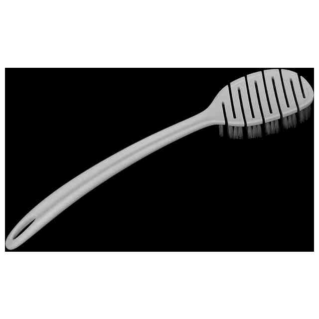 このボディブラシはブラシ毛が植毛されたヘッドと柄から構成されており、ヘッドには互い違いに平行する切り込み設けられている。このため、ブラッシング時に、シャワーの水が隙間を通って体の表面まで十分に供給される。