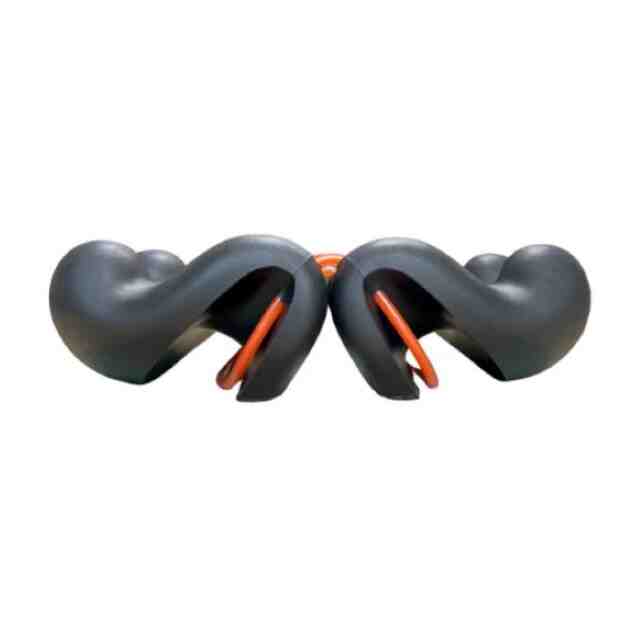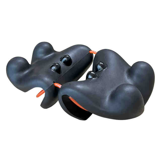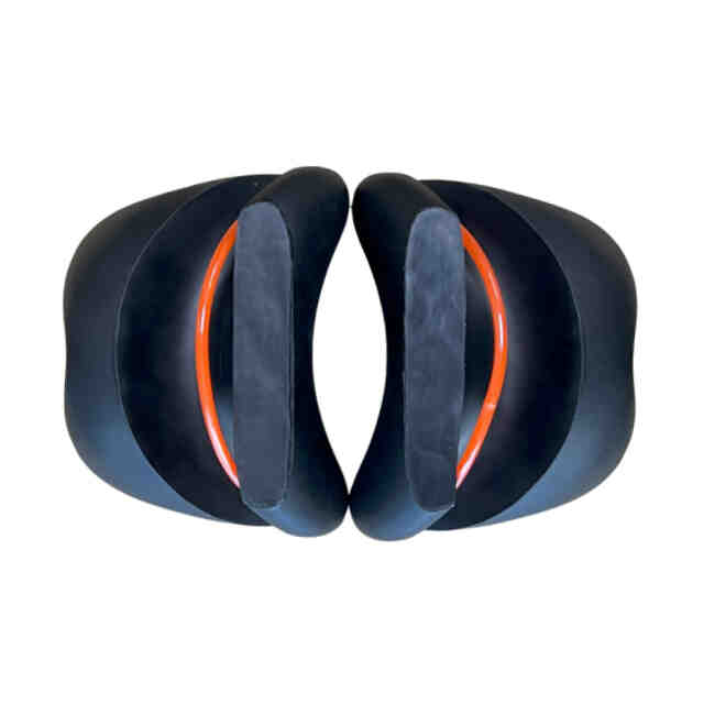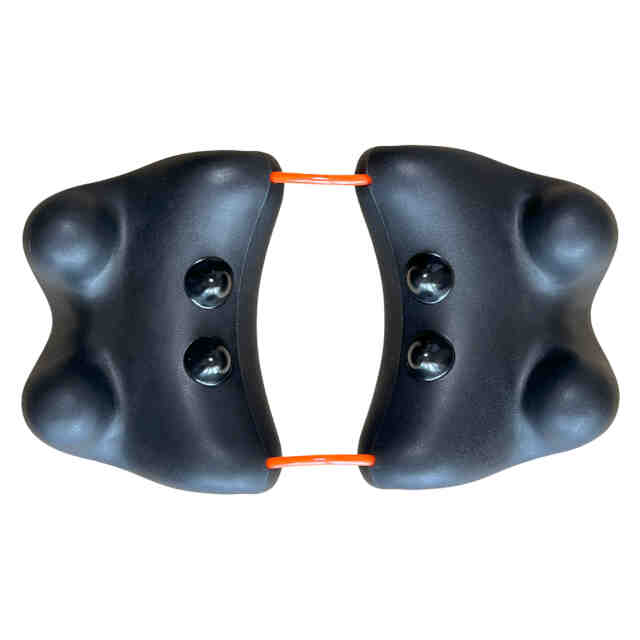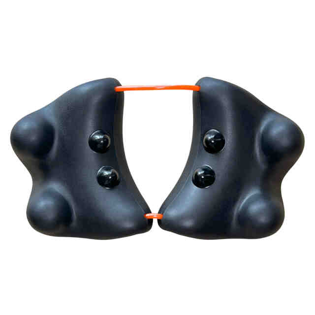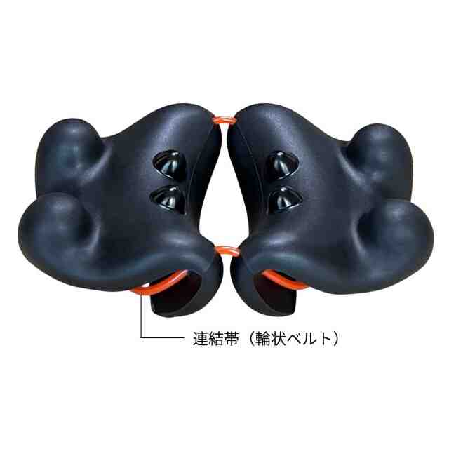 1. 本物品は、その突起部を使用者の身体の一部に押圧することにより、使用者の疲労している部位や緊張している筋肉等を刺激できる指圧器である。 2. 本物品を床に置き[使用状態を表す参考図(1)]に示すように寝転んだり、または椅子に置き[使用状態を表す参考図(2)]に示すように座るなどして、使用者が本物品の突起部に目的の身体の部位を乗せて使用する。 3. 本物品は、同一形状の二つの指圧器と連結帯(輪状ベルト)からなる。指圧器と連結帯(輪状ベルト)は、[参考斜視図(2)]に示すように指圧器内側のそれぞれ2か所の貫通孔に通して連結されている。これにより、それぞれの指圧器の間隔を変化させて、使用者の体格や使用する身体の部位に応じた本物品の形状に変化させることができる。また、本物品は指圧器の底面部を両手で持って、使用者自身や他人の身体の一部に突起部を押圧したり、さらに、摩ったり振動させることで、あんま・指圧マッサージとしての効果も発揮する。