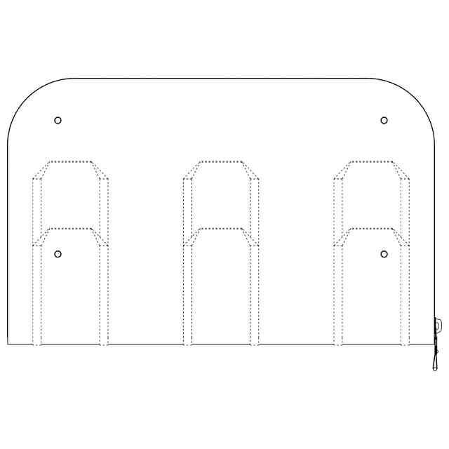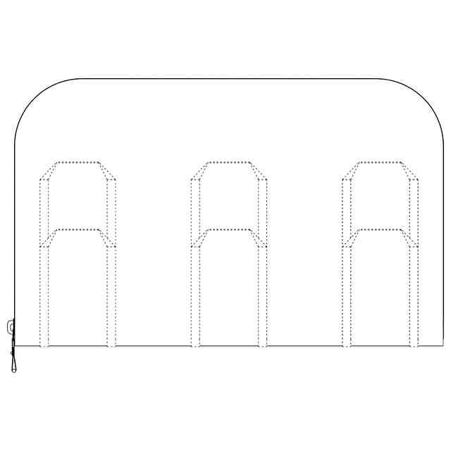 本物品は鮪等の大型魚を保冷しながら運搬,保管等するための大型魚用保冷バッグである。本物品の大きさは正面図において横2550mm、縦1550mmである。本物品は、参考斜視図に示すように、1枚のシート状に形成されており、図中の一点鎖線として表した折り返し線に沿って二つ折りにして使用する。また、本物品は、可撓性および防水性を有する2枚の生地を重ね合わせ、その間にウレタン等の断熱性の高い素材を挟み込んで形成されている。使用状態では左右辺および上辺が一連の止水ファスナーで閉塞されているため、内部から水が漏れにくくなっている。また、前面には内部の水を放出するための4つの水栓が設けられている。参考斜視図に示すように広げた本物品の半分の位置(折り返し線の右上または左下)に魚を載置して本物品を上述のように折り返し、止水ファスナーを閉めることにより、本物品に魚を収容することができる。