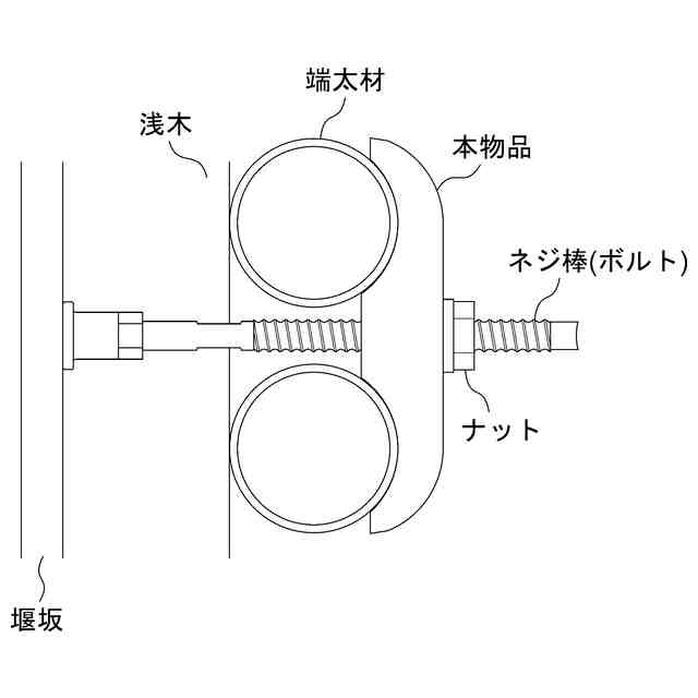 本物品は、例えば、使用状態を示す参考図に示すように、コンクリート型枠締付具のネジ棒(ボルト)に取付け、ナットにより締め付けることにより丸管等の断面が円形状の端太材を浅木に押し付けて堰板を支持するために使用する座金である。