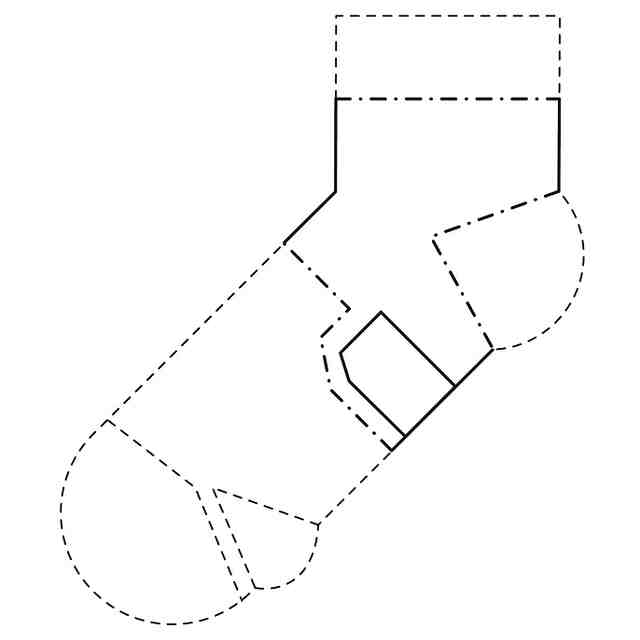 本物品は、足底サポート領域とその周辺及び、足首に至るサポート領域を施した靴下である。足底のアーチ形成を助ける足底サポート領域に加え、足底サポート領域の周辺領域と足首部周辺にわたって、サポート領域を施すことで歩行時の重心軌道を安定させる設計となっている。