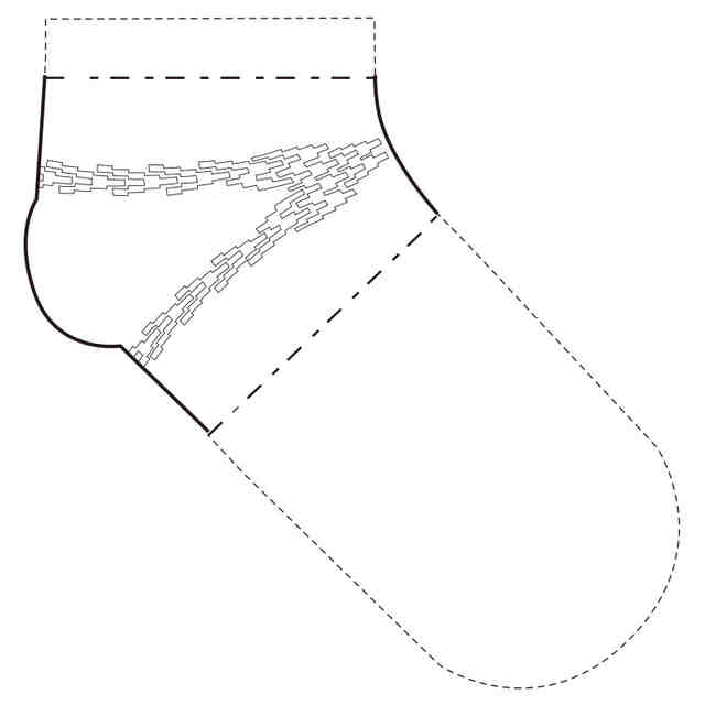本願意匠に係る靴下は、本体部を編成する糸とは異なる糸で編成された本体部より伸縮性の低い低伸縮部を踵部周辺に配している。低伸縮部は、それぞれ独立したV字形状、N字状、M字状などの模様が集まりヘリンボーン柄を構成している。これらの低伸縮部は、靴下を装着して歩行した際に、踵部のズレ・脱げを防止するとともに、過剰な締め付け感のない履き心地の良さを提供することを目的として設けている。