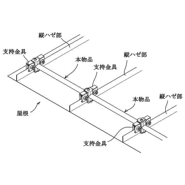 本物品は、「使用状態を示す参考図」に図示したように、例えば、縦葺き屋根の縦ハゼ部に固定した支持金具間に架設する雪止め具である。本物品は、幅約32cm、高さ約5cmの金属製である。