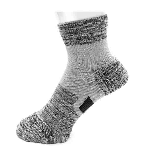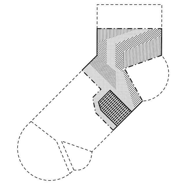 本物品は、足底サポート領域とその周辺及び、足首に至るサポート領域を施した靴下である。足底のアーチ形成を助ける足底サポート領域に加え、足底サポート領域の周辺領域と足首部周辺にわたって、サポート領域を施すことで歩行時の重心軌道を安定させる設計となっている。また、各サポート領域は、その部位に適して編地に変えることでより最適なサポート効果を施すことが出来る