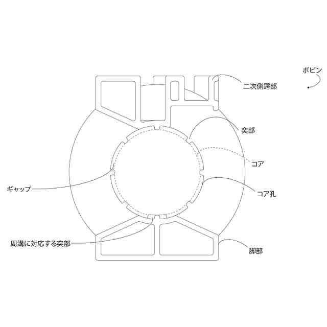 本物品は、トランス、リアクトル、チョークコイル等に用いられるボビンであり、巻線が巻き付けられるものである。ボビンは、一次巻線が巻き付けられる第一筒部と二次巻線が巻き付けられる第二筒部を有するとともに、一次巻線が挿通される一次側鍔部および二次巻線が挿通される二次側鍔部を有している。第一筒部と第二筒部は、セパレート部によって区画されている。セパレート部の壁面であって、第二筒部の周面には、セパレート部の外側に突出する環状の段部が設けられ、二次巻線は外側に突出する段部に乗り上げるように巻き付けられる。また、段部には周溝が設けられるとともに、第一筒部および第二筒部の周面には、横溝が設けられている。周溝および横溝は、一次巻線および二次次巻線が巻き付けられた状態で放熱樹脂が浸透可能となっている。更に、ボビンの軸方向にはコア孔が空けられており、コア孔にはコアが挿入される。コア孔の内周面側には複数の突部が設けられており、突部を介してコアとコア孔の内周面との間にはギャップが形成される。複数の突部のうち底部側の突部は横溝に対応する位置の突部となっている。ボビンの底部には、脚部が設けられている。