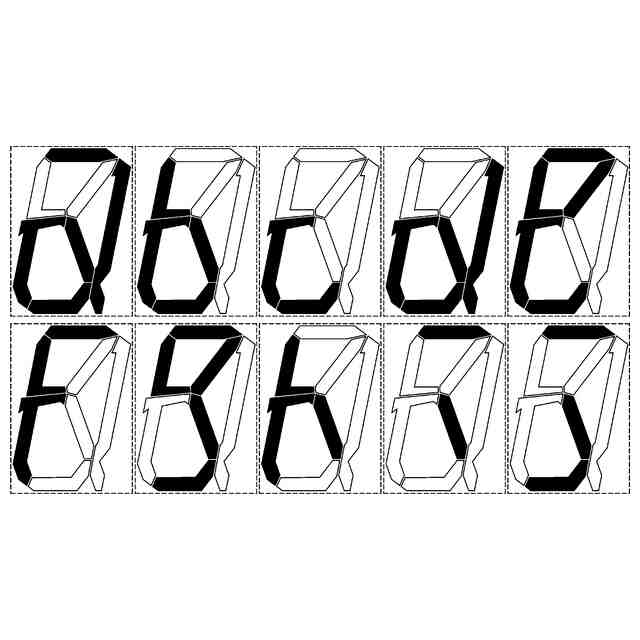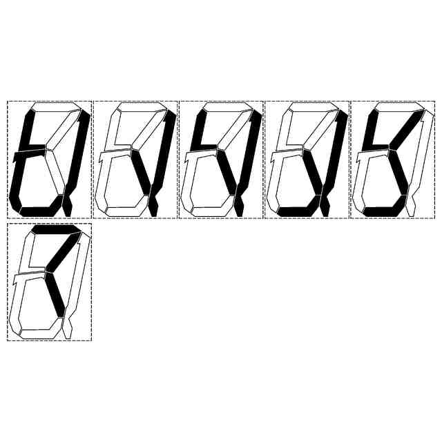 この意匠に係る物品は、複数のセグメントから構成されており、セグメントの組み合わせによって、使用状態を示す参考図1~4に示すように、0~9の数字とa~zのアルファベットを表示するものである。