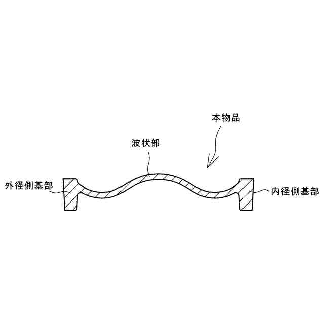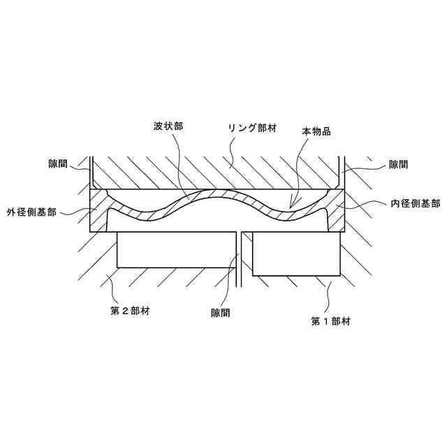 本物品は、例えばCVDやドライエッチング装置などの半導体製造装置に使用されて好適な半導体製造装置用シール材である。本物品の半導体製造装置用シール材は、B-B拡大断面図および本物品の構成を示す参考図のように、波状部と、波状部の外径側の端部に設けられた外径側基部と、波状部の内径側の端部に設けられた内径側基部と、から成るものである。また本物品の使用状態を示す参考図のように、本物品は、隣り合う第1部材および第2部材と、これら第1部材と第2部材の上部に位置するリング部材との間に装着されて用いられるものである。本物品により、第1部材とリング部材との隙間および第2部材とリング部材との隙間から、第1部材と第2部材との隙間に、例えば半導体製造装置内で生成された副生成物が侵入しないようにすることができる。