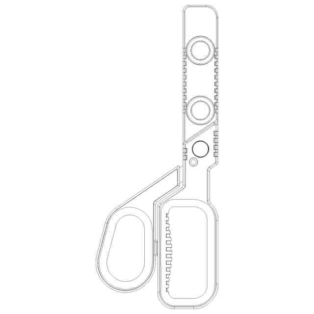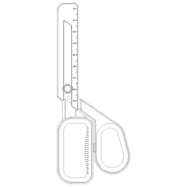 本願の意匠に係る物品は、ハサミであって、キャップが取り付けられている。キャップを外すと、キャップを外した状態の参考図に示すように、一方の刃体の峰部にノコギリ刃が形成され、その反対側の刃線の先端にカッター刃が形成され、その刃体がくの字に折り曲げられており、ハサミ、カッター、ノコギリの3用途(3モード)で使用可能である。