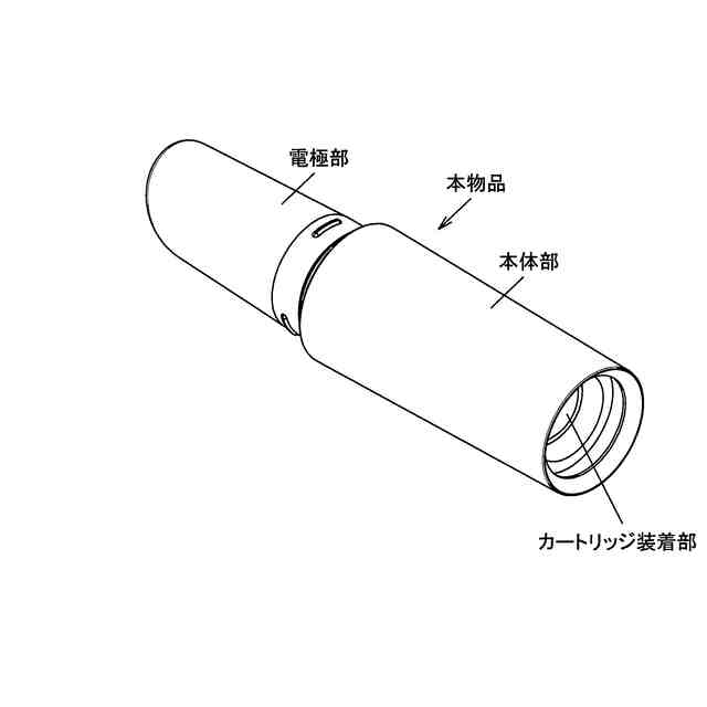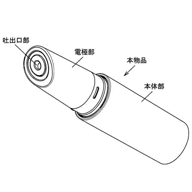 本物品は、顔に押し当てて使用する美顔器である。各部を説明する正面、底面及び左側面を表す参考図及び各部を説明する正面、平面及び右側面を表す参考図に示すように、本物品の本体部後端のカートリッジ装着部に美容液を充填したカートリッジを装着し、本物品の本体部と電極部に同時に触れるように片手で持って本物品を顔に押し当て、微弱電流が流れた状態で電極部先端の吐出口部から美容液を吐出させることにより、肌の奥深くに美容成分を浸透させるものである。