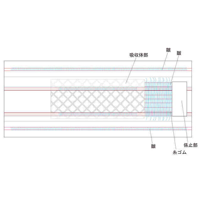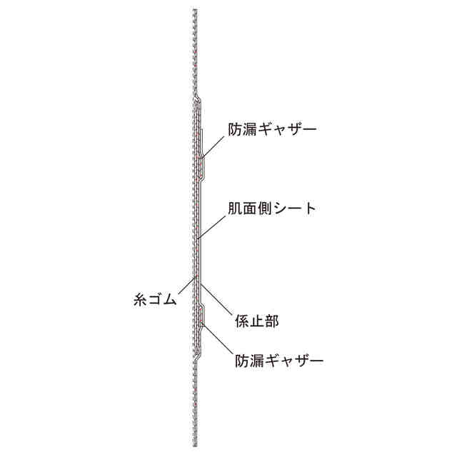 実線で表された部分が、部分意匠として意匠登録を受けようとする部分である。一点鎖線は、部分意匠として意匠登録を受けようとする部分とその他の部分との境界のみを示す線である。本願意匠において、肌面側シート及び防漏ギャザーは薄い不織布で形成されるため透光性を有し、その内側及び向こう側に見える構造体が透けて表れ、各図面上細線で表している。「各部名称を示す参考正面図」及び「各部名称を示す参考B-B拡大断面図」において、赤色部分は糸ゴムであり、「各部名称を示す参考正面図」において、水色部分は皺である。