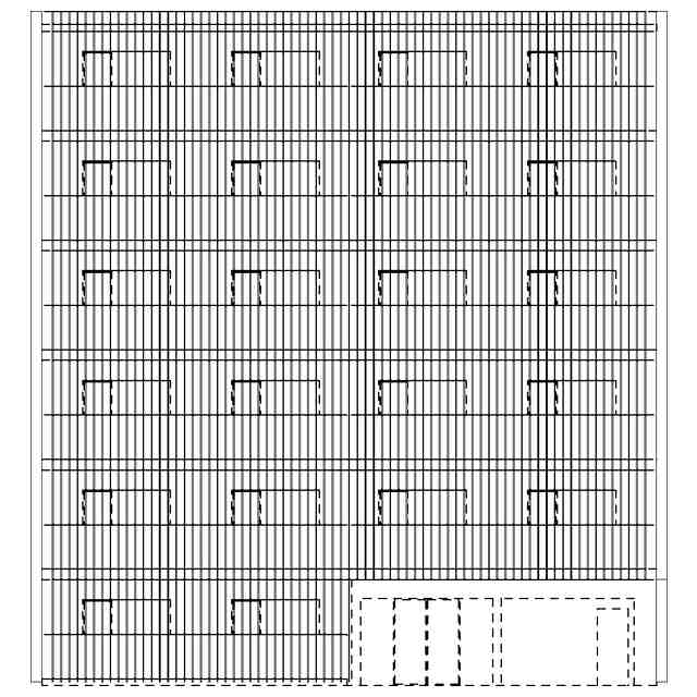 意匠登録を受けようとする部分を実線で、それ以外の部分を破線で表している。一点鎖線は、意匠登録を受けようとする部分とその他の部分との境界のみを示す線である。拡大正面図は、正面図の一部を拡大して表した図である。底面図は平面図と同一につき、底面図を省略する。