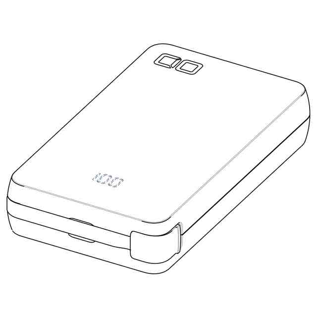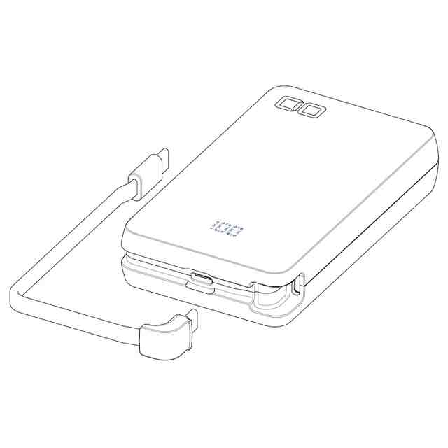 本物品はモバイルバッテリーであり、その外観部には、正面に設けられた「CIO」のロゴとバッテリー残存率表示部が表れている。背面には電源プラグが回動で出し入れ可能に収納される。参考斜視図1は、電源プラグを出した状態を示す。右側面と底面との角から底面、左側面にかけてUSBケーブルを収容する溝部が設けられ、左側面にUSBコネクタ(タイプC)が係止され、参考斜視図2に示すように、USBケーブル及びUSBコネクタは溝部から外すことができる。電源ボタンは、物品下部に搭載されたタッチセンサに代替されており、物理ボタンとしては外観部に表われていない。