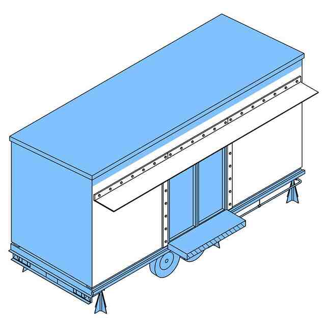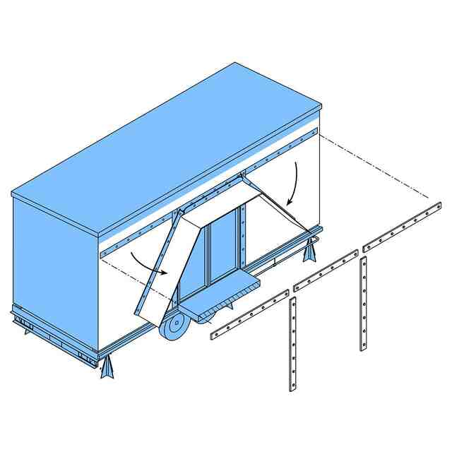本物品は、台車に載せられて自動車によって牽引・搬送され、定置可能な場所に定置されるトレーラーハウスであり、一側面にシート材が設けられている。シート材は、基端部が、トレーラーハウスの一側面に対して取り付けられており、シート材の基端部における長さ方向の両端部を、トレーラーハウスの一側面に対して着脱させて、取り付け向きを変更可能できる。