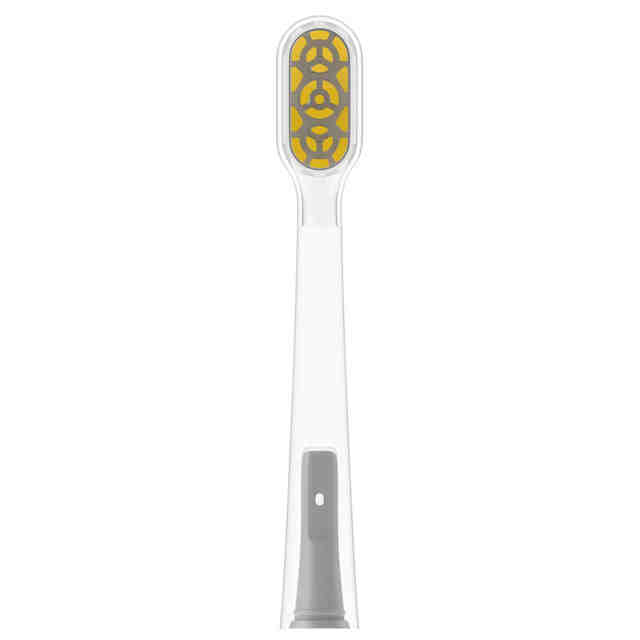 図示のように、透明な歯ブラシヘッドである。黄色に着色した部分以外の部分が、部分意匠として意匠登録を受けようとする部分である。各図の表面全体に表された濃淡は、いずれも立体形状を特定するためのものである。
