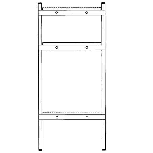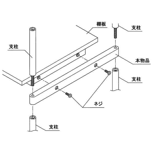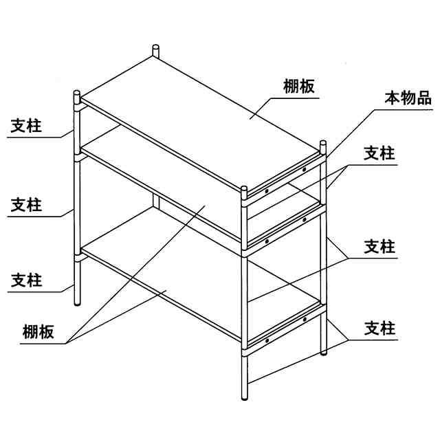 本物品は、収納棚である。本物品は、棚板と、棚板の左右端に連結される枠と、枠の前後端部を上下から挟んで連結されてなる円柱状の複数の支柱とによって組立可能に構成されてなる(使用状態を示す参考図(1)、(2))。枠の前後端部の周面は半円形状に形成されてなる。本物品の支柱と枠との接続部分は、A-A部分拡大図に示すように、正面もしくは背面から側面にかけて円弧状の曲面によって面が一致して、一体的に観察されるように構成される。