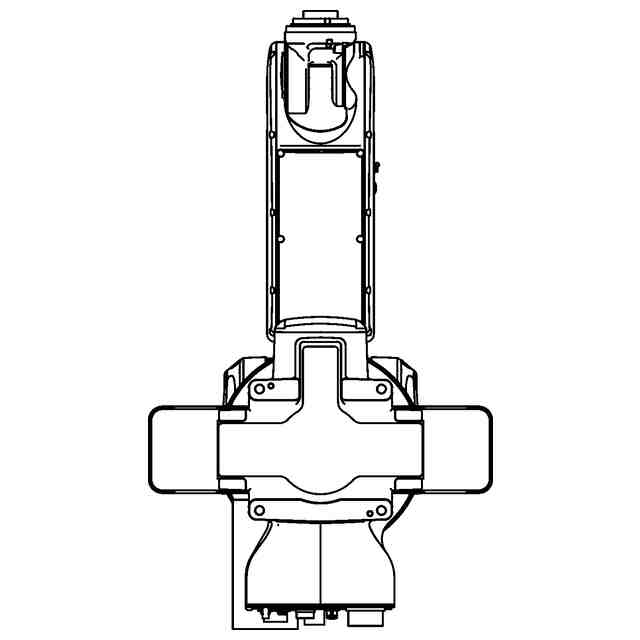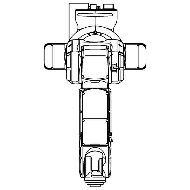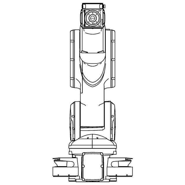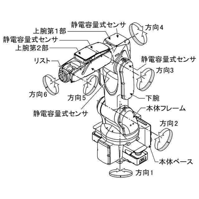 本体ベースにはレーザスキャナが左右に配置されている。「参考斜視図」に示されるように、本体フレームが本体ベースに対して回動可能である。本体フレームの回動方向を方向1で示す。本体フレームから下腕が延設されている。下腕は、その基端部が本体フレームと回動可能に連結されている。下腕の回動方向を方向2で示す。下腕の先端部に上腕が取り付けられている。上腕は、下腕と連結される第1部と第1部の端部から延設される第2部とから成り、第1部と第2部は一体となって下腕に対して回動可能である。上腕の回動方向を方向3で示す。さらに、上腕の第2部は、第1部に対して回動可能である。第2部の回動方向を方向4で示す。上腕の第2部における第1部と反対側の端部に、リストが取り付けられている。リストは、上腕の第2部に対して回動可能である。リストの回動方向を方向5で示す。リストには、図示しない作業用工具が取り付けられる。リストの先端部は、リストの本体部に対して回動可能なので、それに取り付けられた作業用工具が回動する。作業用工具の回動方向を方向6で示す。
