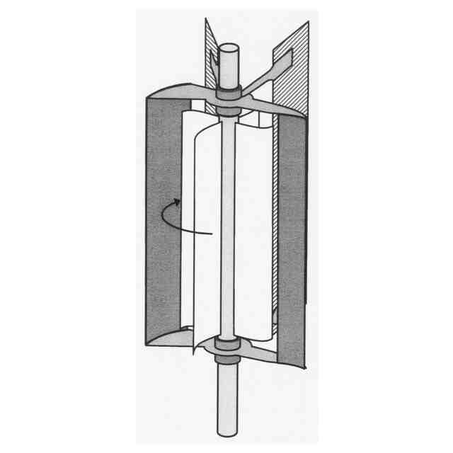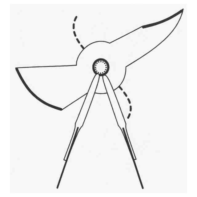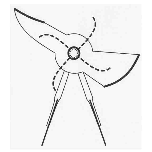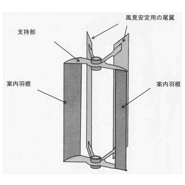 本物品は、垂直軸風車のブレード回転域外側に左右各一枚設置されて用いられる案内羽根である。図に示した垂直軸風車を平面視した場合、左側の案内羽根は、回転軸から見て風上側で左前方部に位置し、また右側の案内羽根は右側方から後方部にかけて位置する。垂直軸風車にとって本来利用し難い回転域外側を流れる風を積極的に回転域内に導けるよう、この案内羽根は左右でその位置が前後することが大きな特徴であり、この前後関係は風車の回転方向によって入れ替わる。案内羽根は風車ブレード回転域の上方と下方の回転軸に回転自在に設けられる支持部に接合され、案内羽根ユニットとして一体的に回転、機能する。ユニット全体が風向に対しうまく追従し易くするために、2枚の案内羽根の向きや大きさが調整されて最適化される必要がある。図の風見安定用の尾翼は風向追従性をさらに高める上で効果的である。