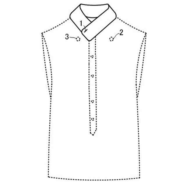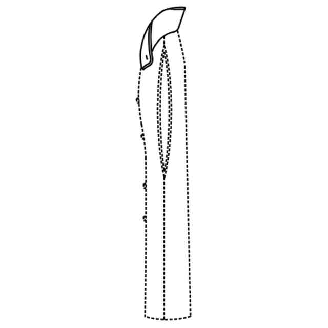 実線で表した部分が部分意匠として意匠登録を受けようとする部分である。参考図1~3は使用法を示す正面図である。参考図1及び2に示すように、左右の両襟は、それぞれの先端部に設けられたボタンホールに衣服本体の胸元付近に設けられたボタンを通して開きを固定することができる一方、参考図3に示すように閉じることもできる。