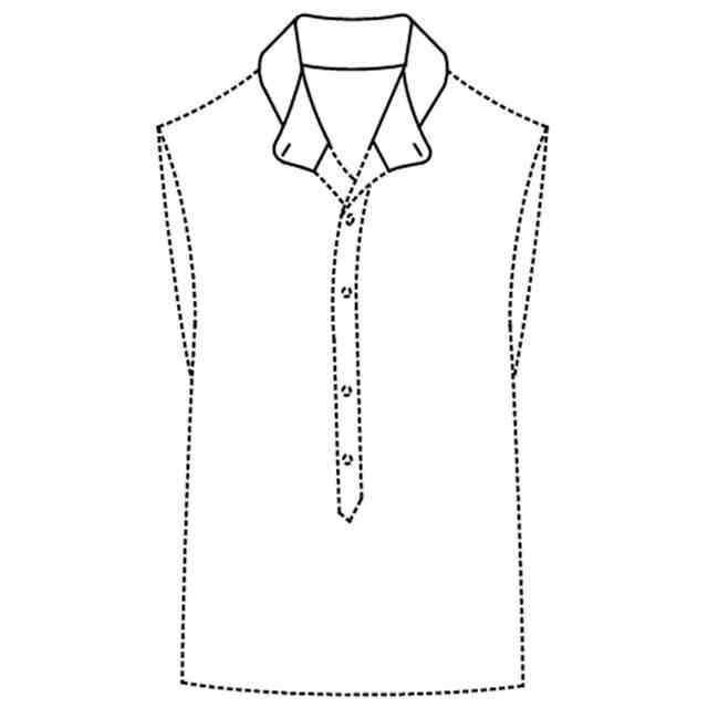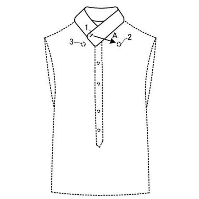 この衣服は襟を開いて洋服のように着こなせる一方、和服のように襟の後ろは引き下げて着物の衣紋を抜くような着こなしを可能とし、洋服と和服の両方の要素を取り入れていることを特徴とする。また、襟を閉じることによって着物を重ね着したときの半衿のような見せ方ができる。参考図1及び2に示すように、左右の襟の先端部にはそれぞれボタンホール1、4が設けられている。また、衣服本体の正面視右胸元付近にボタン2が設けられ、衣服本体の正面視左胸元付近にボタン3が設けられている。襟を開く場合は、参考図1に示すように、ボタン2をボタンホール1に通して正面視右側の襟の開きを矢印A方向に固定する。そして、正面視左側の襟の先端部は、参考図2に示すように、ボタン3をボタンホール4に通すことによって矢印B方向に開きを固定する。一方、襟を閉じる場合は、参考図3に示すように、正面視左側の襟を右側の襟の内側に潜らせたうえで、正面視右側の襟を閉じる。