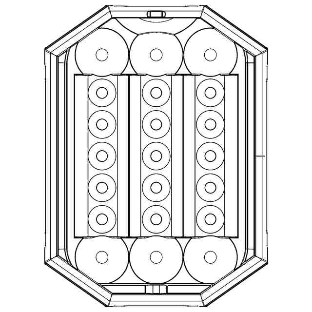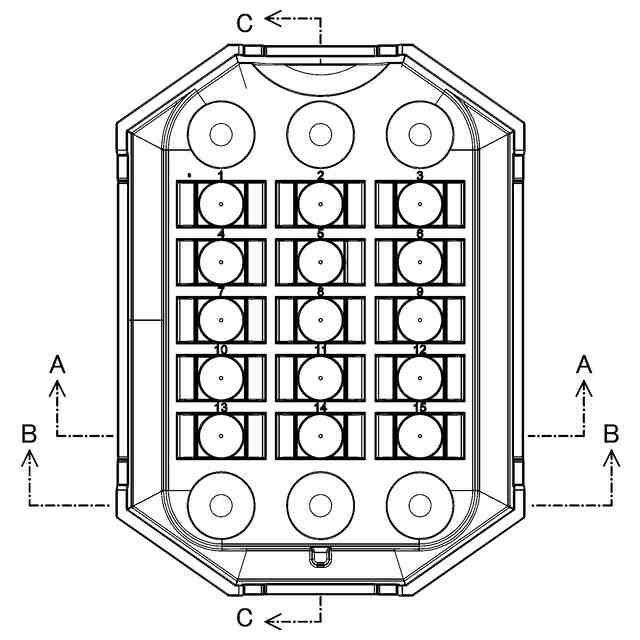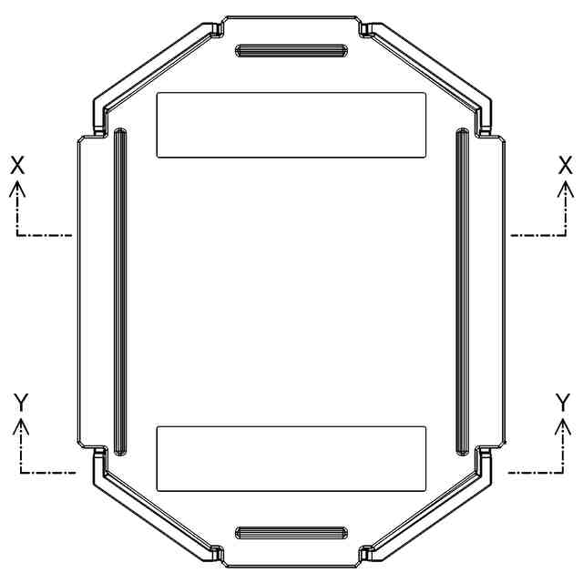 本願に係る物品(以下、「本物品」という。)は、細胞や胚の培養に用いられる略八角形形状のディッシュである。本物品は、本体と蓋体とからなる。本物品は、全体に八角形形状を有し、「平面図」の図示上下方向の長さは、この方向に直交する図示左右方向の長さより大きい。 本物品の本体は、「本体平面図」、「本体A-A線端面図」および「本体C-C線端面図」に示すように、中央部に、それぞれが独立したマイクロウエルを15個備える。マイクロウエルは、3列×5行に配列されている。3列×5行のマイクロウエルの存在領域の図示上下方向両側には、「本体平面図」、「本体B-B線端面図」および「本体C-C線端面図」に示すように、それぞれ3個の液溜まりとしての窪みを図示左右方向に一列に並べて備える。 本物品の本体のマイクロウエルは、「本体平面図」、「本体A-A線端面図」および「本体C-C線端面図」に示したように、中心に円錐形の窪みを備え、その図示左右方向両側に中心の円錐形の窪みに連続する底面が平らな凹部を備える。また、本物品の本体の液溜まりは、「本体平面図」、「本体B-B線端面図」および「本体C-C線端面図」に示したように、底部が平らな円形の窪みとして形成されている。 本物品の蓋は、本物品の六面図に示すように、図示上下方向および左右方向の幅は、本体の対応する方向の幅より広く、蓋を本体に被せると、「蓋平面図」の図示上下方向および左右方向の端部において、蓋の上下方向および左右方向の端部は本体の側面上端部に載置される。 蓋は、「蓋底面図」、「X-X線端面図」および「蓋を底面図側から見た参考斜視図」に示すように、「蓋平面図」の図示左右方向両側の端辺に、本体側に向かって突出する突起を備える。左右両側の突起間の内寸は、同方向の本体側部の外寸より僅かに大きい。本物品の「平面図」および「Y-Y線端面図」に示すように、蓋の図示右下、左下、右上、左上の各斜辺は、本体の対応する側部の各斜辺より内側に位置する。このため、本体に被された蓋は、八角形形状のいずれの辺の方向の移動も制限される。