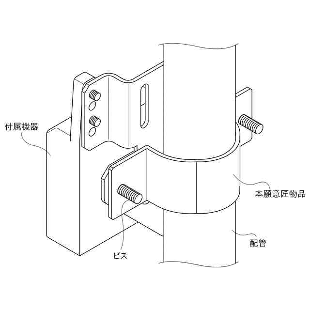 本願意匠に係る物品は、例えば、「使用状態を示す参考図」に示すように、配管等に取り付けられて、ガスメーター用の通信機や負荷計測器等の付属機器を取り付けるために用いられる取付具である。