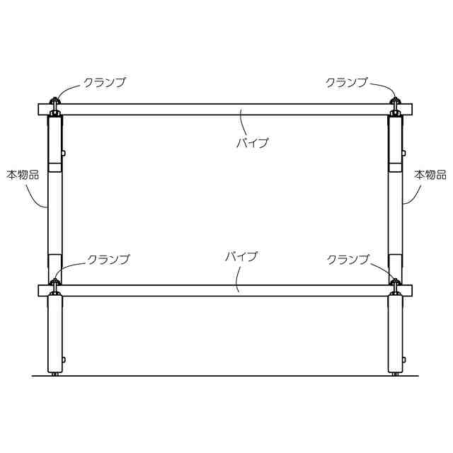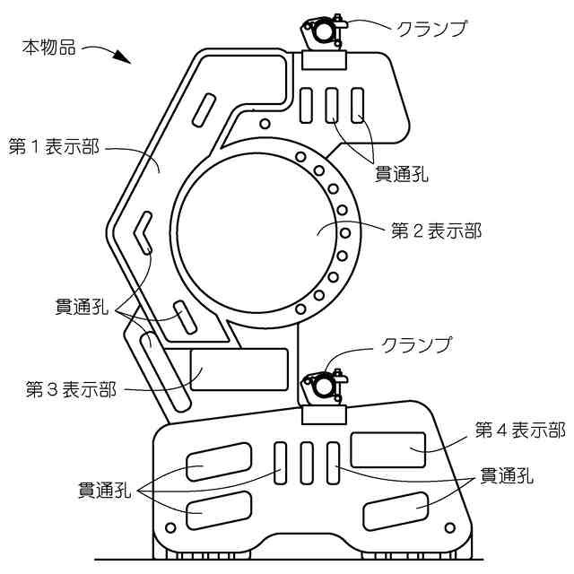 本物品は、パイプや金属製ネットでバリケードを構築するための支持脚である。支持脚には、前後に貫通する貫通孔が複数個設けられており、その前後面には、第1から第4の表示部がそれぞれ設けられている。各表示部は凹部からなり、第1表示部はく字状に形成され、第2表示部は円形状に形成され、第3および第4の表示部は横長四角形状に形成されている。各表示部には、例えばキャラクター、動植物などを印刷したステッカーや、夜間の視認性を向上させるための反射材などが貼り付けられる。パイプでバリケードを構築する場合には、使用状態を示す参考図1、2に示すように、一対の支持脚の上半部と下半部の2箇所にクランプを固定したうえで、支持脚の間に橋架したパイプの両端をクランプで固定して、一対の支持脚を一体化する。