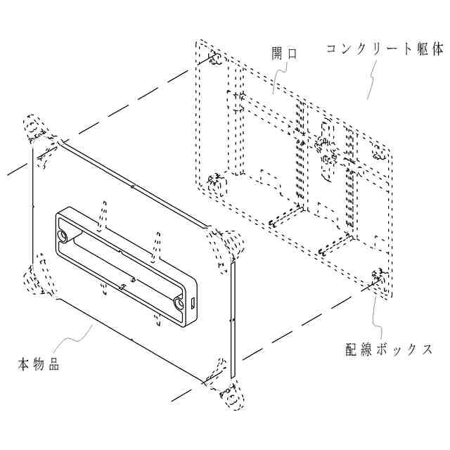 本物品は、ケーブルや電線管が接続される配線ボックスの開口を覆う配線ボックス用カバーに関するものである。使用状態参考図により説明すると、本物品は、コンクリート躯体内にその表面に開口が臨むように設置された配線ボックスに対して当該開口を覆うように取り付けられ、本物品を介してスイッチやコンセント等の電気機器を前記配線ボックスに取り付けることができる。