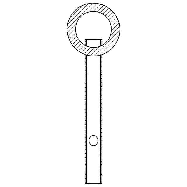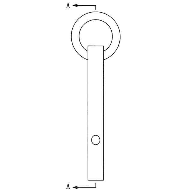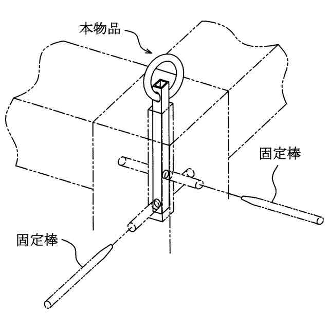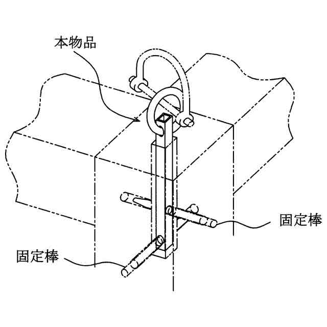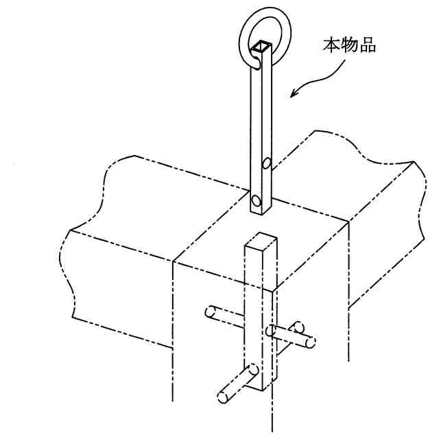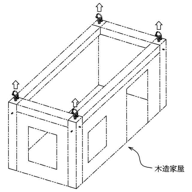 本物品は、木造家屋を吊り上げる際に用いられる木造家屋吊上用金具である。本物品は、各部の名称を示す参考図に示されるように、角パイプによって形成される本体と、本体の上端付近に取り付けられるリングとを備える。本物品の本体およびリングは、金属で形成される。本体の下端付近には、固定棒を挿入するための2組の貫通穴が互いに直交するように設けられている。本物品を用いて吊り上げようとする木造家屋の柱の上端には、使用状態を示す参考図1に示されるように、本体とほぼ同辺長であって、かつ本体の長さよりも浅い角柱形の穴が設けられている。使用状態を示す参考図2は、本物品が角柱形の穴に挿入された状態が示されている。角柱形の穴が本体の長さよりも浅いので、本物品の上部が柱の上端から露出した状態になっている。柱には、本物品が挿入された際に貫通穴が位置する箇所に穴があけられており、これらの穴に固定棒を挿入することによって本物品が脱落しないように固定される。本物品の固定を万全にするために、角柱形の穴および/又は本体の外面に、接着剤を塗布してもよい。木造家屋の吊り上げに際して、使用状態を示す参考図3に示されるように、本物品のリングにシャックルを取り付け、使用状態を示す参考図4に示されるように、シャックルにワイヤを引っ掛けて、ワイヤをクレーンで吊り上げることによって、木造家屋を所望の個所に移動・運搬させることができる。或いは、シャックルを用いずに、本物品のリングにワイヤを直接引っ掛けて、ワイヤをクレーンで吊り上げることによって、木造家屋を所望の個所に移動・運搬させてもよい。