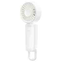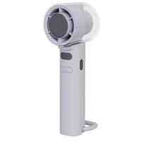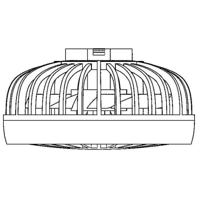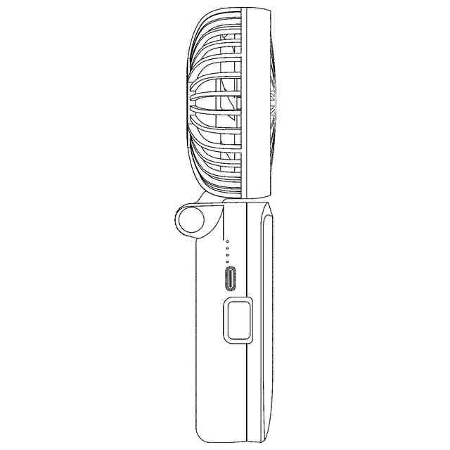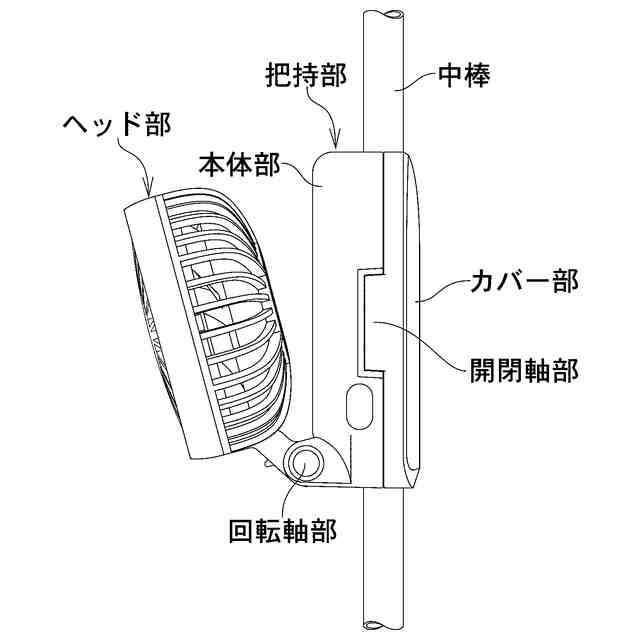 本願の意匠に係る物品は、手持ち式の扇風機である。この扇風機は、「参考斜視図」に示すように、ファンを備えたヘッド部と、使用時に把持される把持部とを備え、ヘッド部と把持部とが回転軸部を介して連結されている。ヘッド部は、「斜視図」、「正面図」、「背面図」、「平面図」、「底面図」、「右側面図」及び「左側面図」に示す基本形態から、回転軸部を中心に「ヘッド部を回転させ、かつ、カバー部を開いた状態の左側面図」に示す背面側に180度回転させた位置まで、任意の角度に調整が可能である。把持部は、「参考斜視図」に示すように、本体部と、本体部に開閉軸部を介して連結されて開閉が可能なカバー部を有している。カバー部は、「斜視図」、「正面図」、「背面図」、「平面図」、「底面図」、「右側面図」及び「左側面図」に示す基本形態から、開閉軸部を中心に「ヘッド部を回転させ、かつ、カバー部を開いた状態の左側面図」及び「A-A線断面図」に示す位置まで開くことができる。また、本体部の内側には、「A-A線断面図」及び「参考A-A線断面図」に示すように、背面側に向けて窪んだ凹部が本体部の長手方向に沿って形成されている。さらに、カバー部の内側には、カバー部を閉じたときに本体部の凹部に対向するようにして、「ヘッド部を回転させ、かつ、カバー部を開いた状態の左側面図」、「A-A線断面図」、「参考A-A線断面図」及び「ヘッド部を回転させ、かつ、カバー部を開いた状態の参考左側面図」に示すように、バネにより付勢された押圧板が設けられている。そのため、本体部の凹部に傘の中棒を配置した状態でカバー部を閉じると、中棒が押圧板により押圧されて、「傘に取り付けた状態の参考右側面図」に示すように、中棒の任意の位置に把持部を取り付けることができる。また、凹部及び押圧板には、滑り止め用のゴムパッドが設けられている。