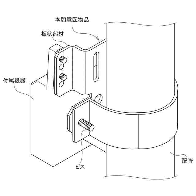 本願意匠に係る物品は、例えば、「使用状態を示す参考図」に示すように、配管等に取り付けられて、ガスメーター用の通信機や負荷計測器等の付属機器を取り付けるために用いられる取付具である。また、板状部材に設けられた孔部により、結束バンド等を利用して配管等に固定することも可能である。