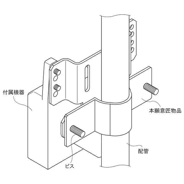 本願意匠に係る物品は、例えば、「使用状態を示す参考図」に示すように、配管等に取り付けられて、ガスメーター用の通信機や負荷計測器等の付属機器を取り付けるために用いられる取付具である。