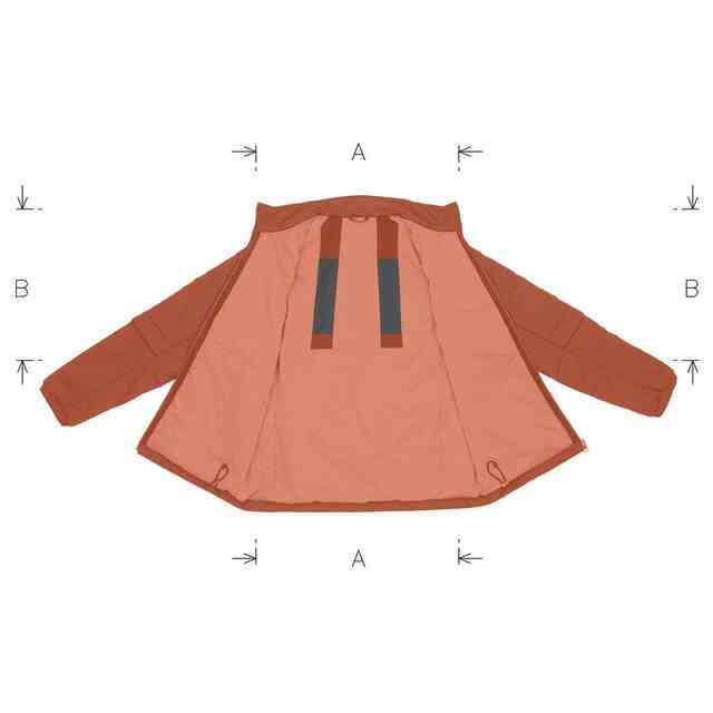 赤色に着色された部分を除く部分が、意匠登録を受けようとする部分である。A-B部参考拡大図において、一点鎖線で示す赤色で着色された部分と意匠登録を受けようとする部分との境界線部分は形状線を表すものではなく、単に境界線を表したものである。前身頃を開いた状態の正面図及びA-B部拡大図を含めて意匠登録を受けようとする部分を特定している。各図において表面部全面に表された濃淡は、いずれも立体表面の形状を特定するためのものである。高伸縮部を示すA-B部参考拡大図において、緑色に着色された部分は高伸縮部である。