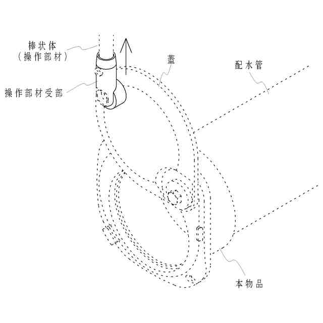 本物品は、農業用水等の水路から水田等の圃場に水を供給する配水管に取り付けられる分水栓に関するものである。使用状態参考図により説明すると、本物品は、配水管の端部に取り付けられ、蓋を開閉することで前記圃場への配水を制御することができる。また、前記蓋には、操作部材受部が設けられており、当該操作部材受部に棒状体からなる操作部材を挿し込んで、当該操作部材を引き上げたり押し下げたりして前記蓋の開閉を操作することができる。