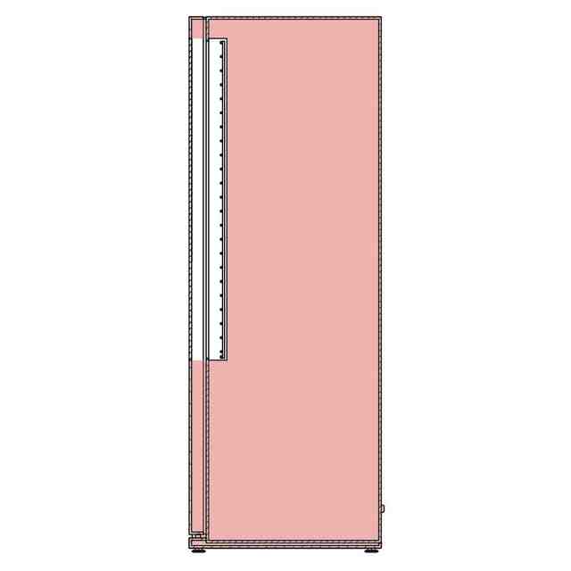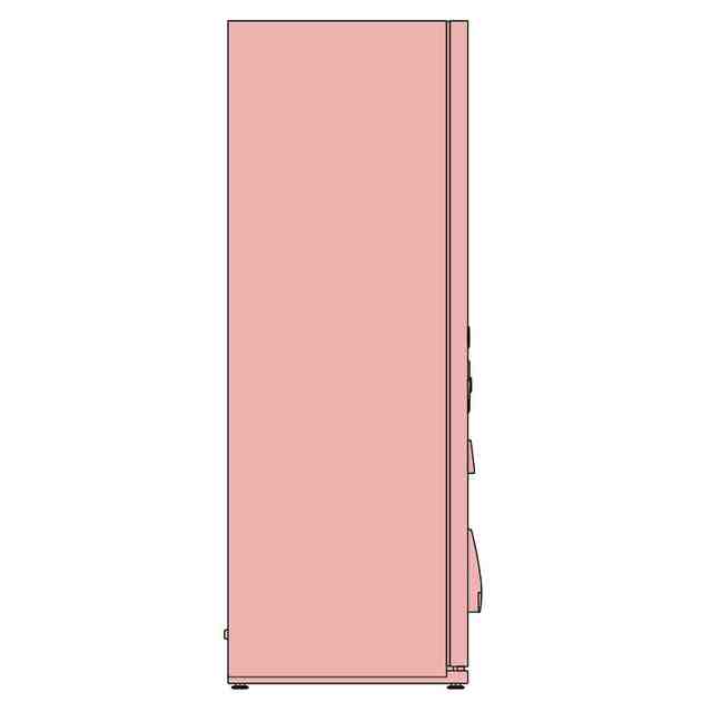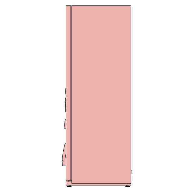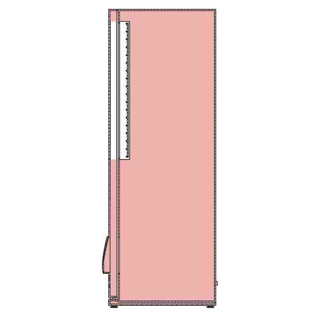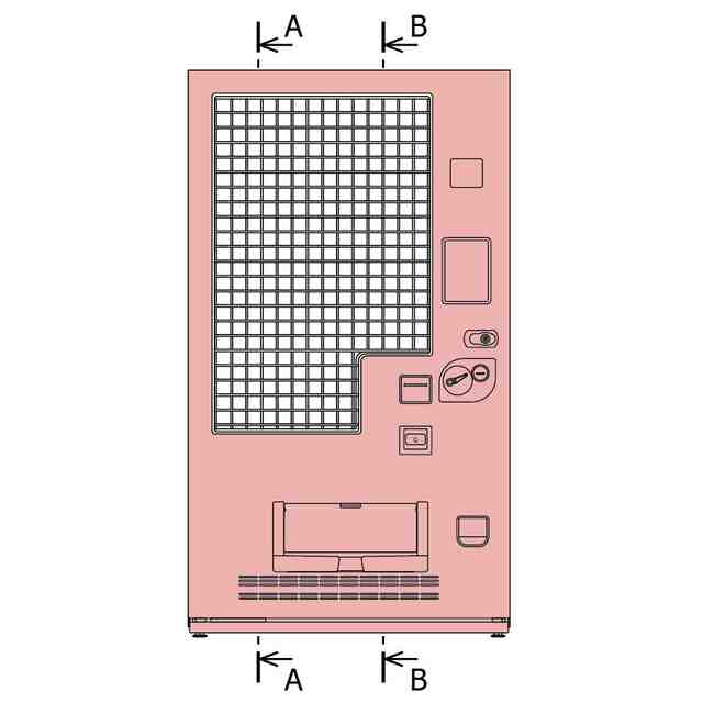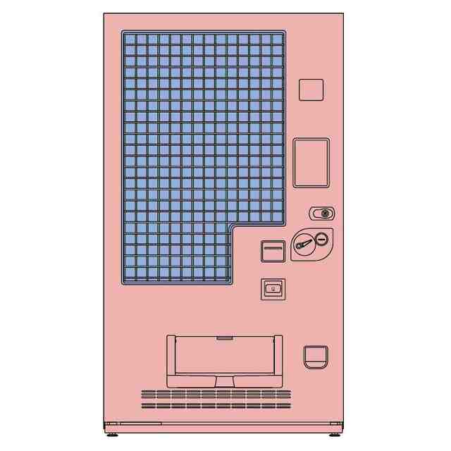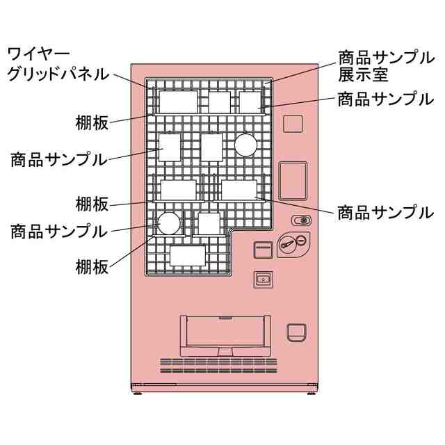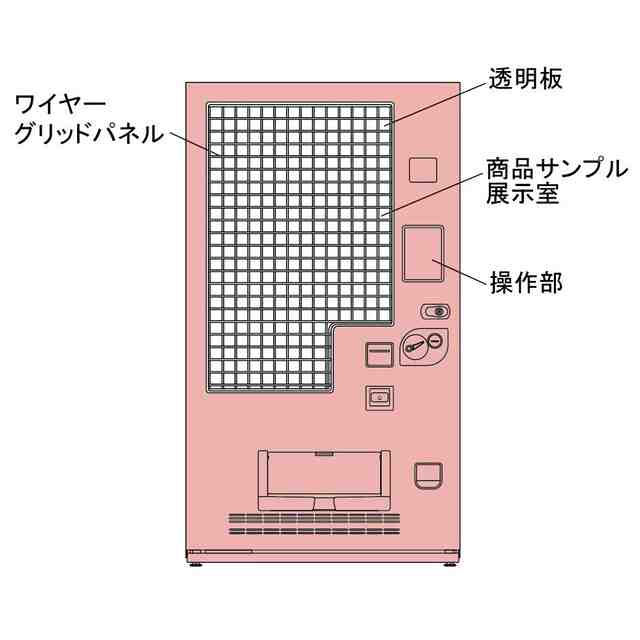 本物品は、主に冷蔵商品や常温商品を販売する自動販売機である。正面にはアクリル板などの透明板を介して内部が視認可能な商品サンプル展示室が設けられ、商品サンプル展示室内の奥にはワイヤーグリッドパネルが取り付けられている。商品サンプル展示室では、使用状態を示す参考正面図に示すように、吊り下げフックなどによってワイヤーグリッドパネルに取り付けられた棚板上に商品サンプルを載置し、及び/又はワイヤーグリッドパネルに取り付けられたフックに商品サンプルを吊るすことが可能である。商品サンプル展示室の正面視右側にはタッチパネル式の操作部が設けられており、そこに表示された商品選択ボタンに触れることで商品の選択を行うようになっている。