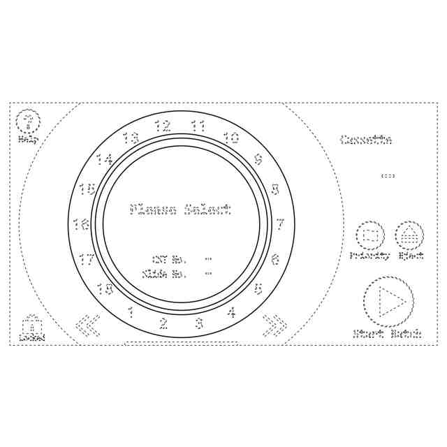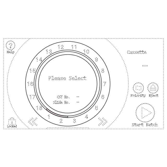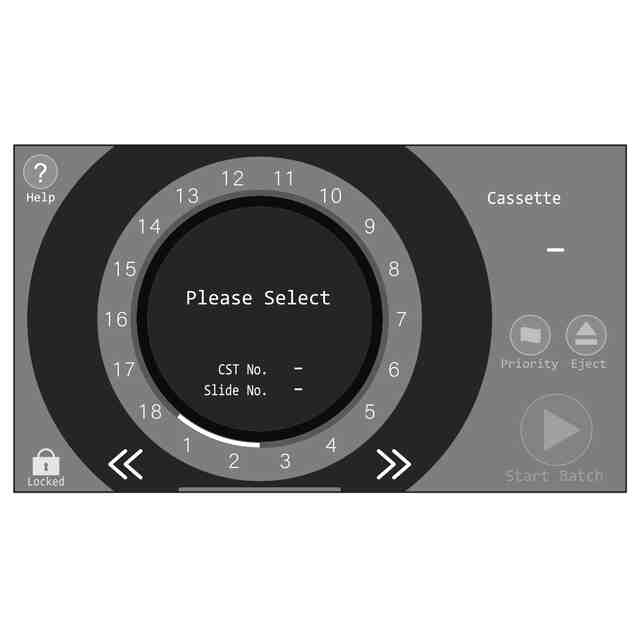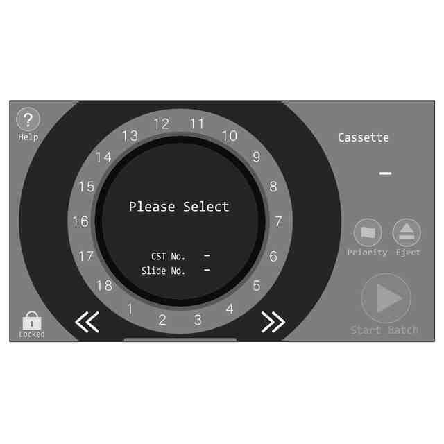 本画像は、デジタルパソロジー機器のスライド回転棚に戴置されるカセット(ガラススライド)の状態に係る各種情報を表示するとともに、デジタルパソロジー機器に係る機能を発揮できる状態にするための操作の用に供される画像である。「画像図」及び「変化後を示す画像図」に示すように、カセット(ガラススライド)の状態や操作等に応じて表示態様が変化する。