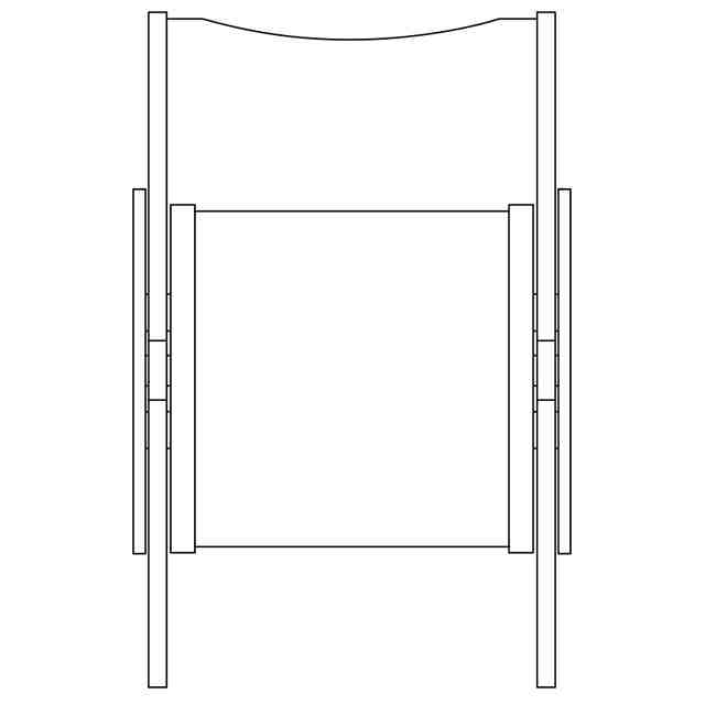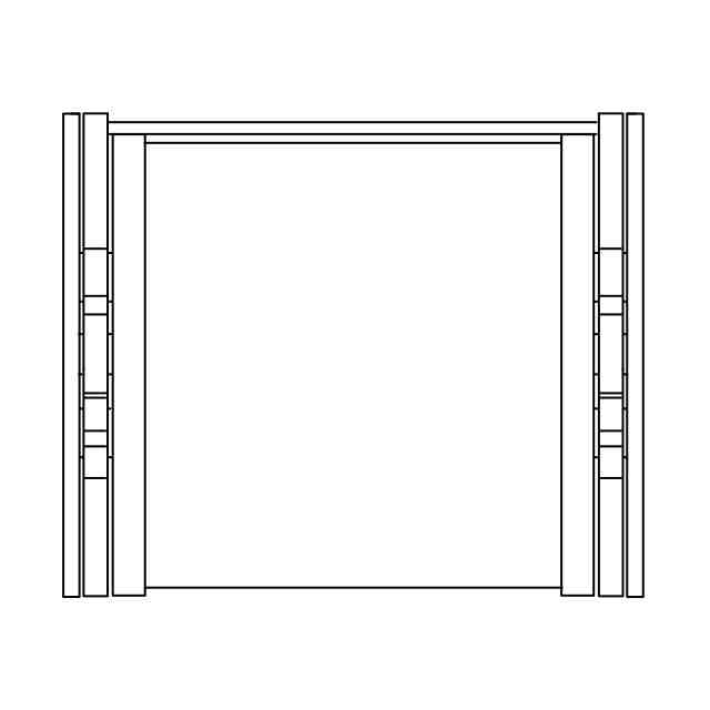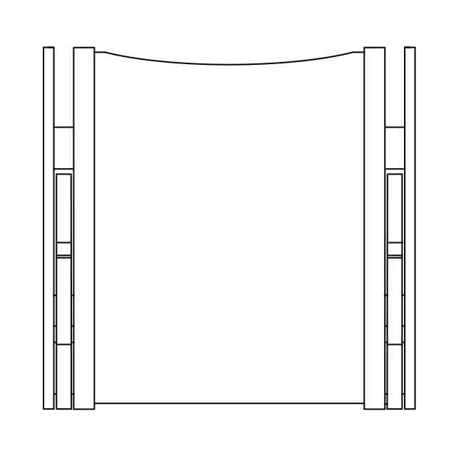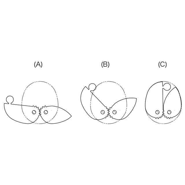 蓋を閉じた状態の各図は、正面図・背面図・右側面図・左側面図・平面図および底面図の状態から、蓋となる部分を閉じた状態を示している。開閉動作を示す参考図は、蓋の開閉に他パーツが連動する様子を(A)~(C)の順又はその逆順に示すものであり、箱本体を透過させて図示している。本体は二点鎖線で示している。