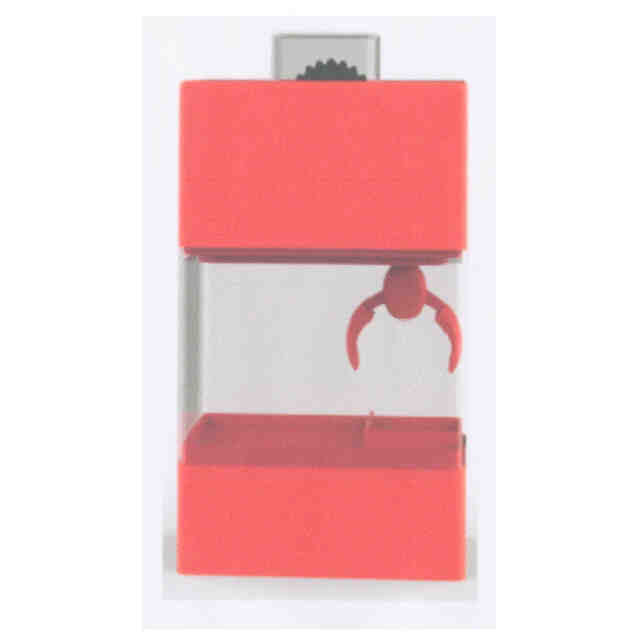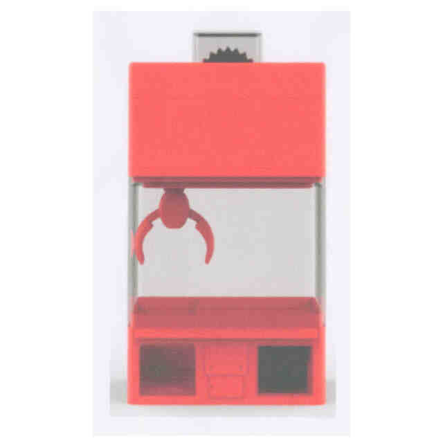 本意匠に係る物品であるクレーンゲームおもちゃは、ダイヤルを回すことにより、支持部が水平方向に移動し、ボタンを押下すことにより、支持部が降下し爪が開閉し内容物を掴み、ボタンを離すことで支持部が上昇し、ダイヤルを回して取り出し口に支持部を移動させ、ボタンを押すことで支持部が降下しアームが開き内容物を落下させ、取り出し口より内容物を取り出すことが出来る。