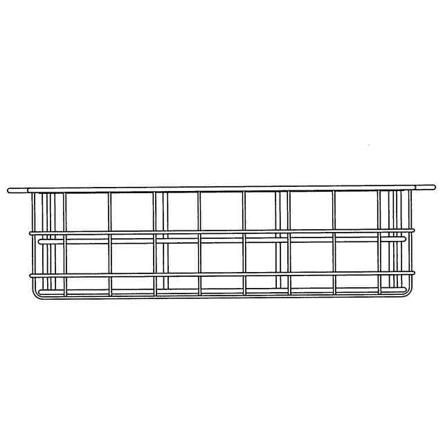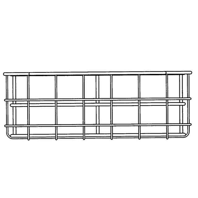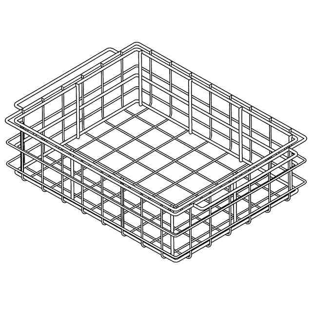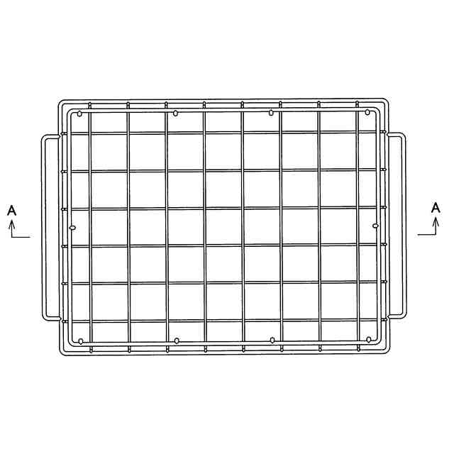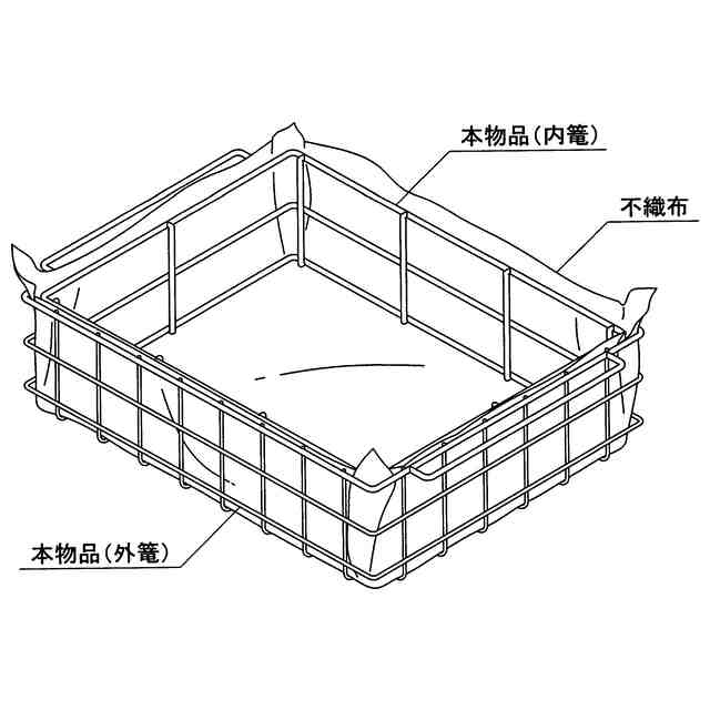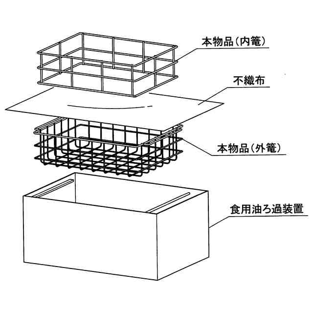 本物品は、揚げカスなどを含んだ使用済みの食用油をろ過する食用油ろ過具である。本物品は、外篭と内篭とからなる二つの金網篭で構成される。外篭は、金属製の線材を格子状に配置してなる有底箱型とされる。内篭は、金属製の線材を格子状に配置してなる無底の矩形筒型とされる。使用にあたっては、使用状態を示す参考図(1)に示すように、外篭と内篭の間に不織布を挟み込んで使用する。不織布を挟み込んだ本物品は、例えば、業務用フライヤーの使用済み食用油を再生する食用油ろ過装置において、使用済み食用油の前処理用のろ過具として使用される。具体的には、使用状態を示す参考図(2)に分解して示すように、食用油ろ過装置の油槽の上部に本物品を配置し、業務用フライヤーから排出される使用済み食用油を本物品で受け止めてろ過することで、使用済み食用油に含まれる揚げカスなどの大きな不純物を除去し、不純物が除去された使用済みの食用油を食用油ろ過装置に供給する。なお、不織布上に揚げカスなどの不純物が溜まってろ過性能が低下したときは、内篭を取り外して、揚げカスなどの不純物ともども不織布を交換する。