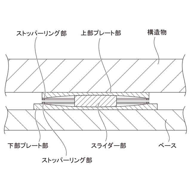 本物品は免震機能を有する支承具である。本物品は、下部プレート部を地面側のベースに取り付け、上部プレート部を建物の柱等の構造物に取り付けて使用する。地震等の揺れが発生した際には、本物品の上下のプレート部及びスライダー部がスライドして互いに位置を変動させて、揺れの絶縁や減衰、及び建物の位置の復元をすることができる。
