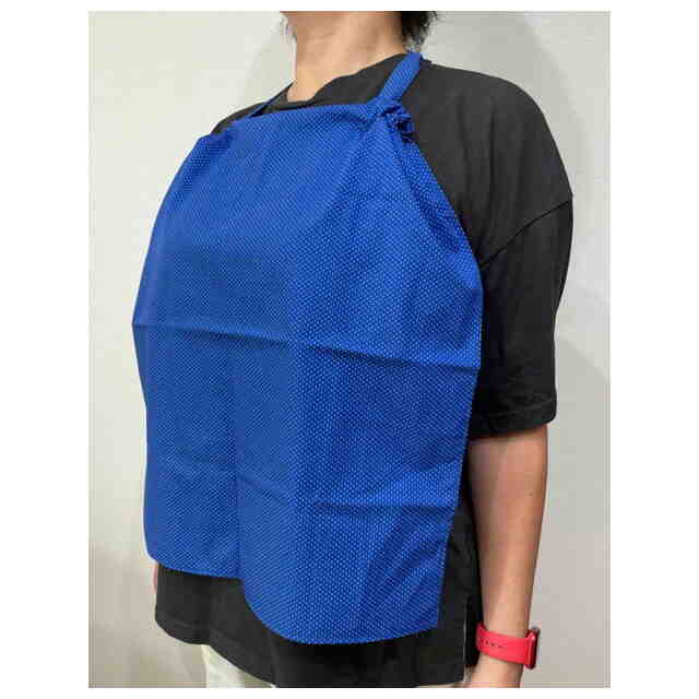 本物品は、ハンカチとして使用するとともに、エプロンや前かけとしても使用できるハンカチである。ハンカチの上辺を背面側に折り曲げて端縁を逢着し、折り曲げた中央部をアーチ状に切り取って、帯体収容部が形成される。「スナップを外した状態を示す参考背面図」に示すように、長い帯体二本は、ハンカチとして使用される時は、二つの留め具で連結され、該連結部が露出した状態で収容される。「使用状態を示す参考斜視図1」に示すように、帯体の連結部分を引っ張ることにより、収容部が収縮して帯体が長く引き出され、両帯体の各端部に設けられた留め具を連結することにより、「使用状態を示す参考斜視図2」に示すように、エプロンとして使用することができる。