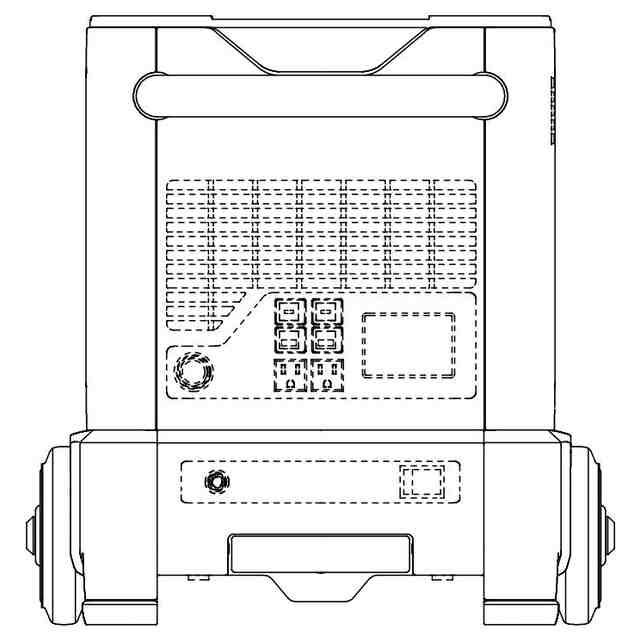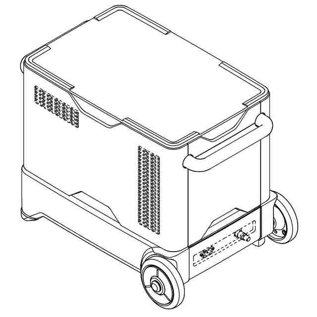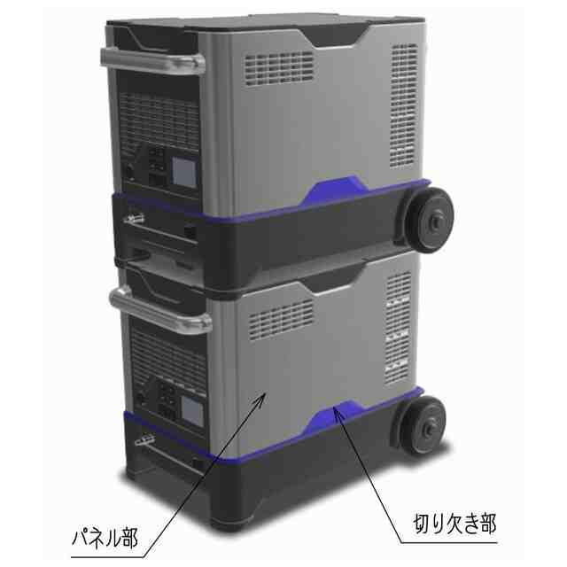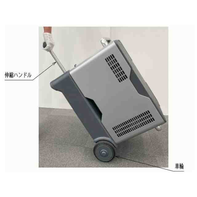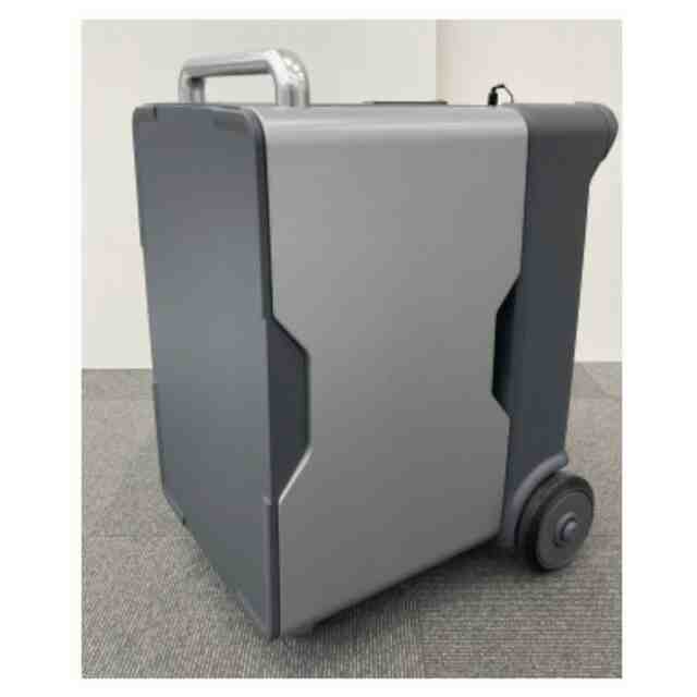 この意匠に係る物品は、屋内又は屋外において用いられる、水素を燃料とするポータブル発電機である。使用状態を示す参考図1に示すように、本物品は、発電運転中には、パネル部下部周辺が点灯する。切り欠き部は、手を差し込んで、本物品を動かす際等に使用することもできる。使用状態を示す参考図2に示すように、本物品は伸縮ハンドル及び車輪を備えるため、一人でも移動させることができる。また、使用状態を示す参考図1及び3に示すように、本物品は、積み重ねたり、縦向きにしたりという態様でも使用することができる。