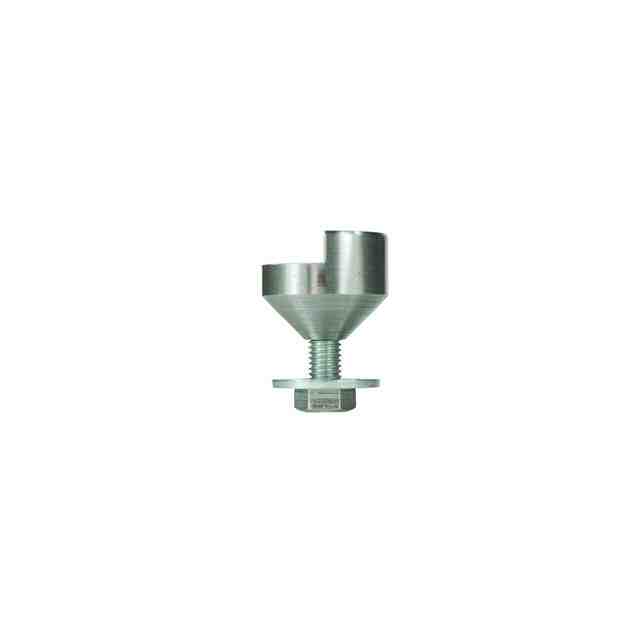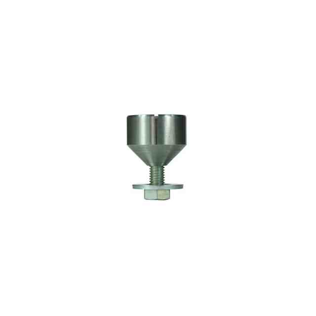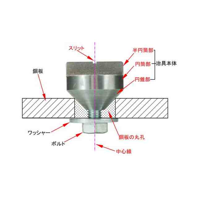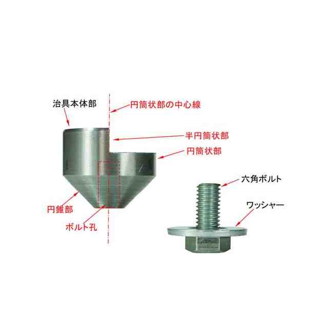 本物品は土木、建築用の柱、梁、基礎杭等に使用する形鋼、厚板等に設けられたボルト絞用丸孔の孔芯位置を精度良く検出するための治具である。構造物の建設に当たっては、構造物の強度確保のため、材料である形鋼、厚板等に設けられた複数のボルト絞め用丸孔の孔芯間寸法、孔芯と材料端等の寸法を精度良く測って記録に残すことが義務づけられている。本治具はその寸法測定のために、丸孔の孔芯位置を高精度に検出するための補助治具である。「構成部品参考図」に示すように、治具本体部、六角ボルト、ワッシャーの3部品で構成されている。治具本体部は、図に示すように半円筒状部、円筒状部、円錐部からなる形状をしており、円錐部の先端部からは円筒状部の中心に向けて、六角ボルトをねじ込むためのボルト孔が形成されている。厚みある鋼板等に設けられた丸孔の孔芯位置を検出する際は「使用状態を示す参考図」に示すように、鋼板の片側から治具本体部の円錐部を丸孔に差し込む。続いて反対側からワッシャーを付けた六角ボルトを差し込み、治具の円錐部に設けてあるボルト孔に差し込んで鋼板を締めつける。締めつけると円錐部の作用により、円筒状部の中心軸が鋼板孔芯に一致し、その中心軸位置が孔芯位置であることが精度良く判明する。治具本体部の円筒状部と半円筒状部の間には段差がある。半円筒状部の上面には平面図に示すように、円筒状部の中心軸位置から段差面直角方向に狭いスリットが設けてある。段差が設けてあるのは、直角定規を使用して他の孔芯、形鋼端部等との間の寸法を測定する際の便宜のためである。