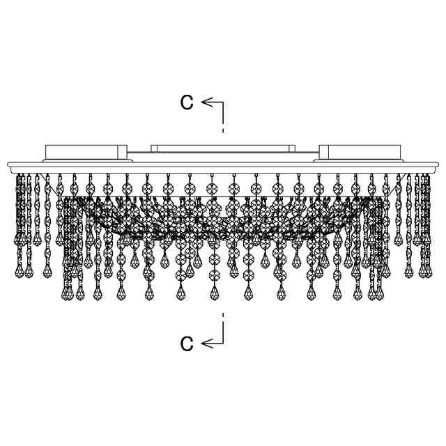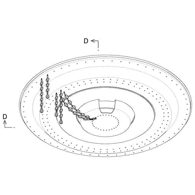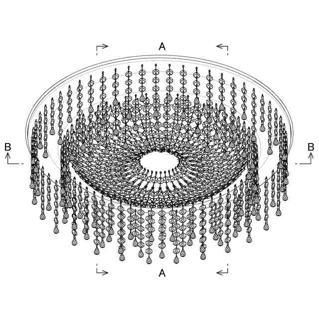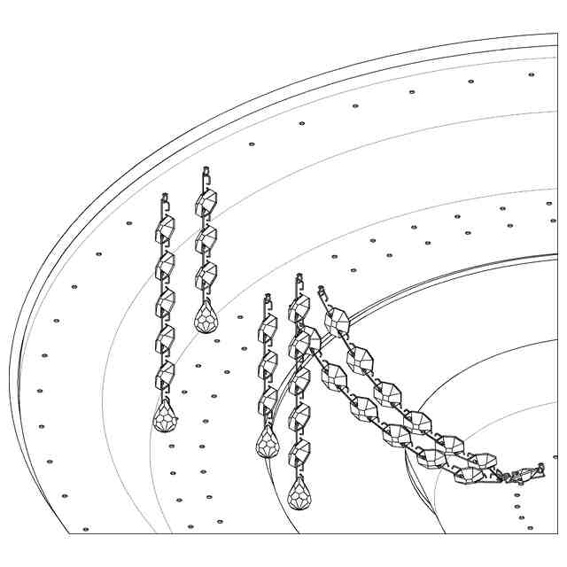 本物品は、「クリスタルチェーンの種類を示す参考A-B部拡大図」に示すとおり、緑、水色、ピンクの色分けにより示された3種類のクリスタルチェーンによって構成されており、「クリスタルチェーンを二列取り付けた状態の拡大斜視図」、「クリスタルチェーンを二列取り付けた状態のC部拡大図」および「D部拡大図」に示したクリスタルチェーンの態様を一単位とし、この単位構成が本体の全周にわたって施されている。