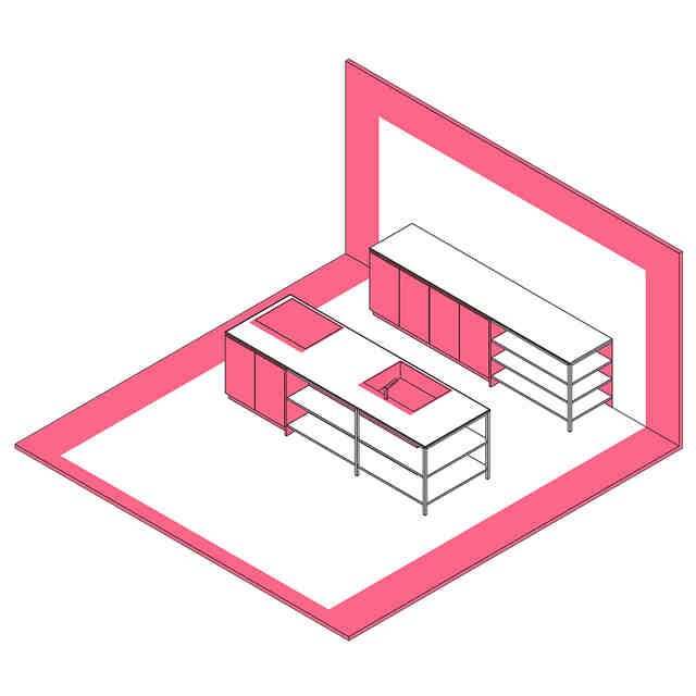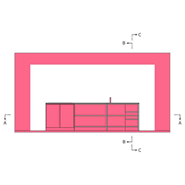 この意匠に係る内装は、例えば住居やオフィス等の部屋に設けられるものであり、対面型のシステムキッチンと、カウンター付きの収納家具を備えている。